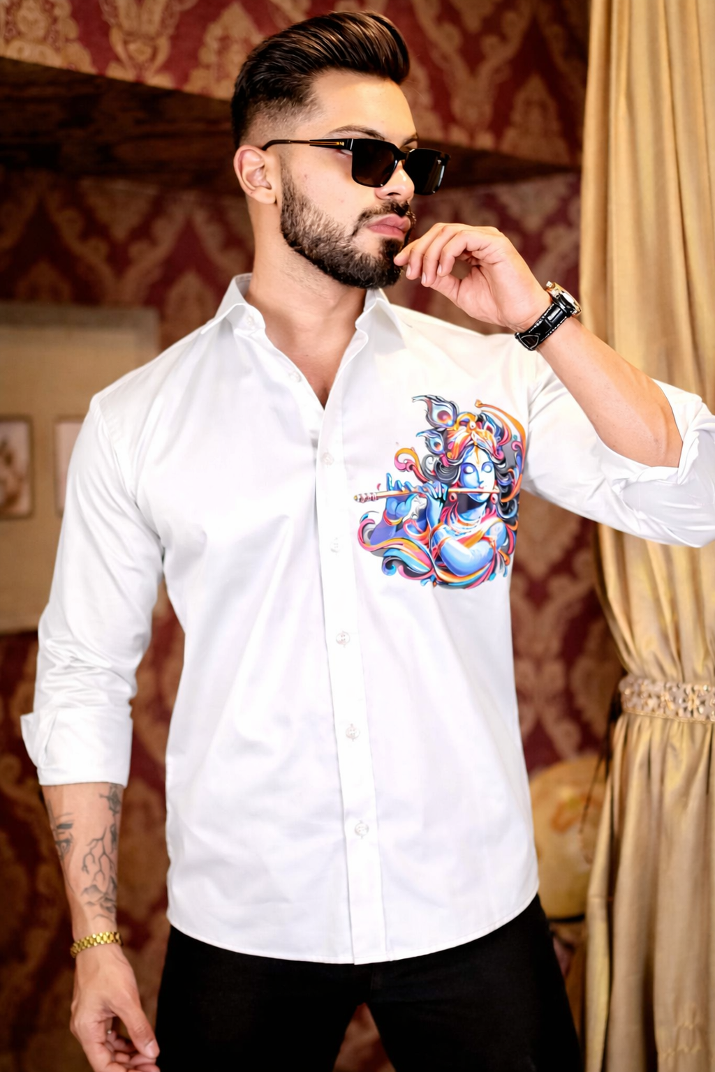 White Lord Krishna Club Wear Printed Satin Cotton Men's Shirt