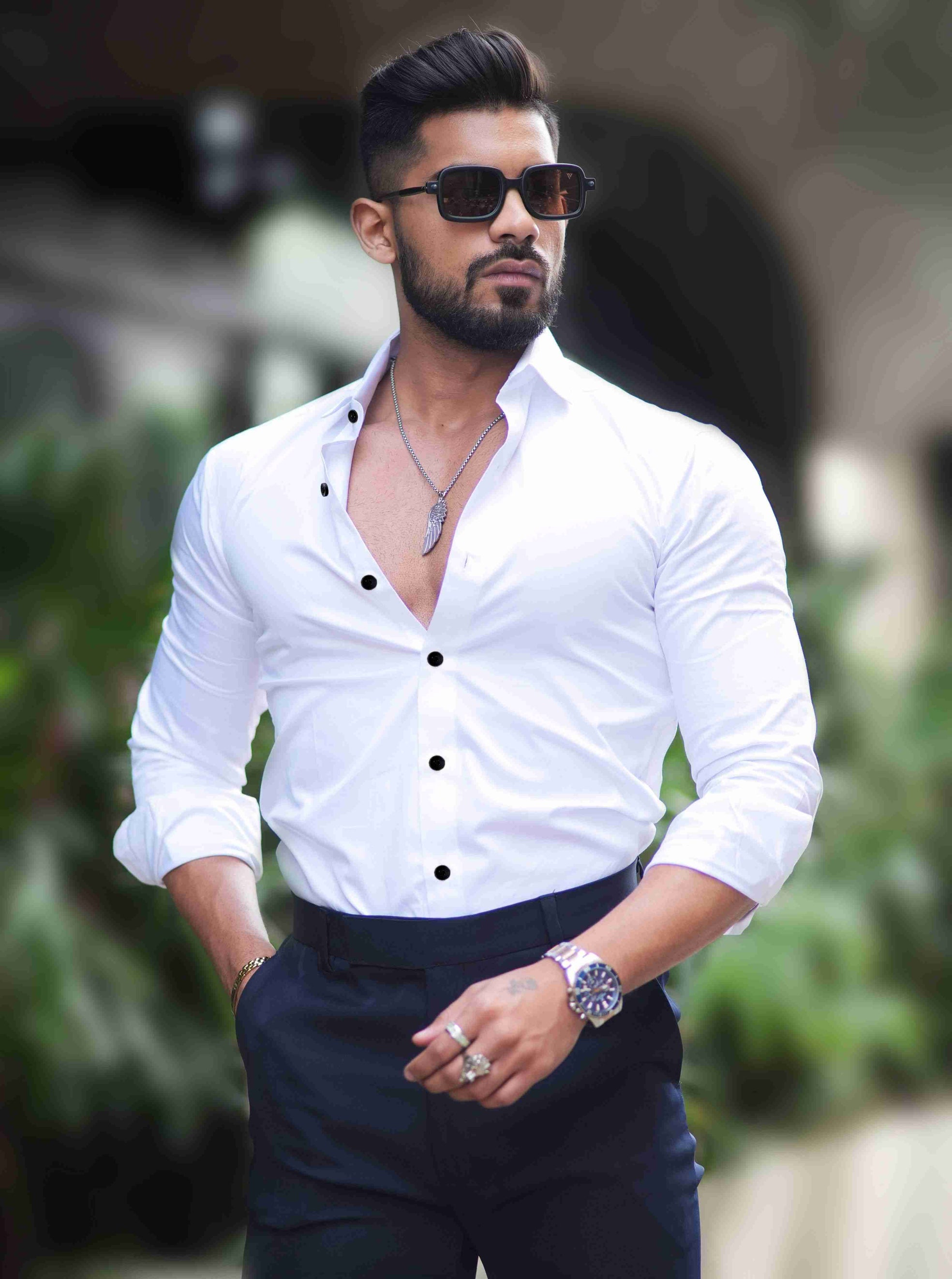 Formy White Smoke Luxury Black Button Satin Shirt For Men's