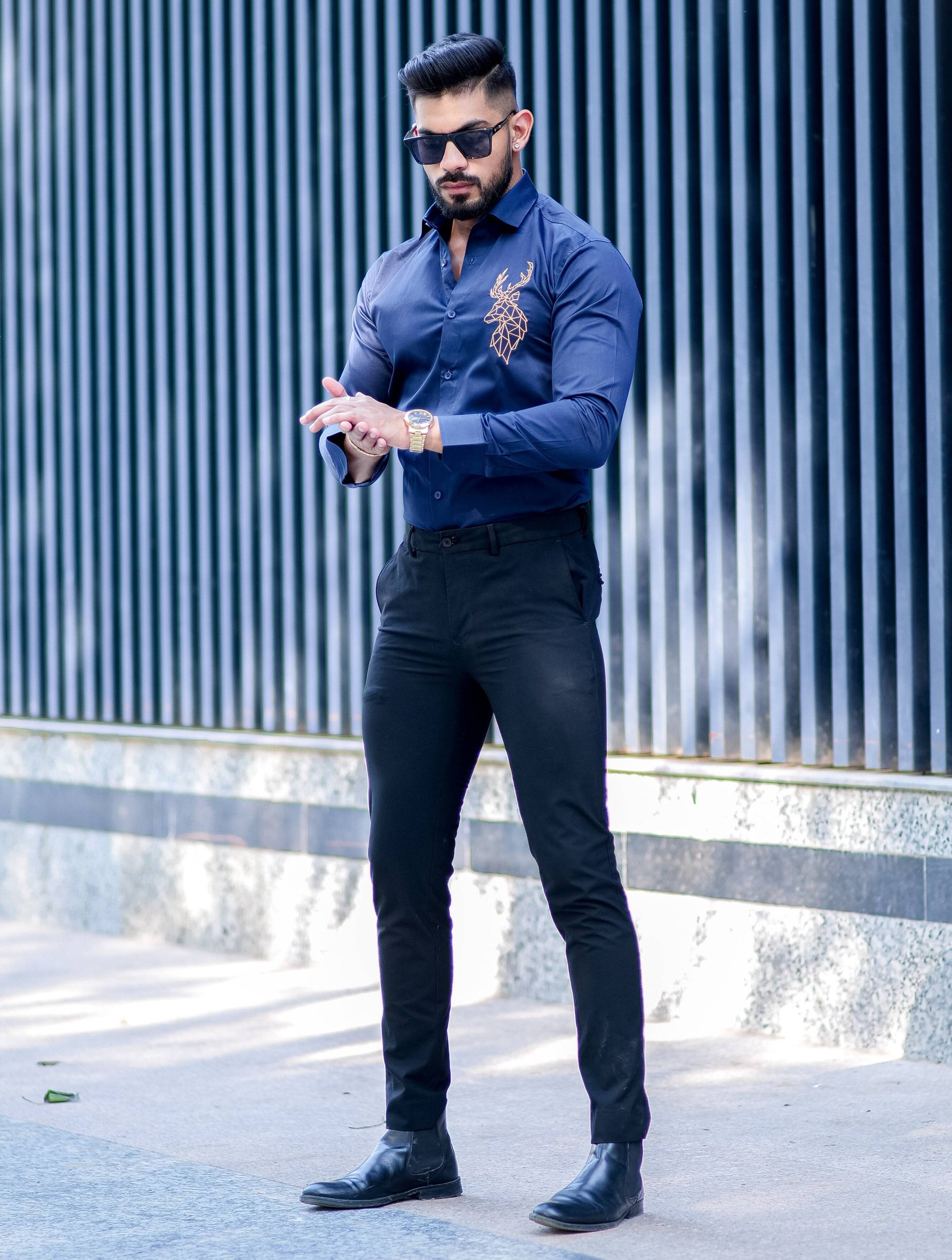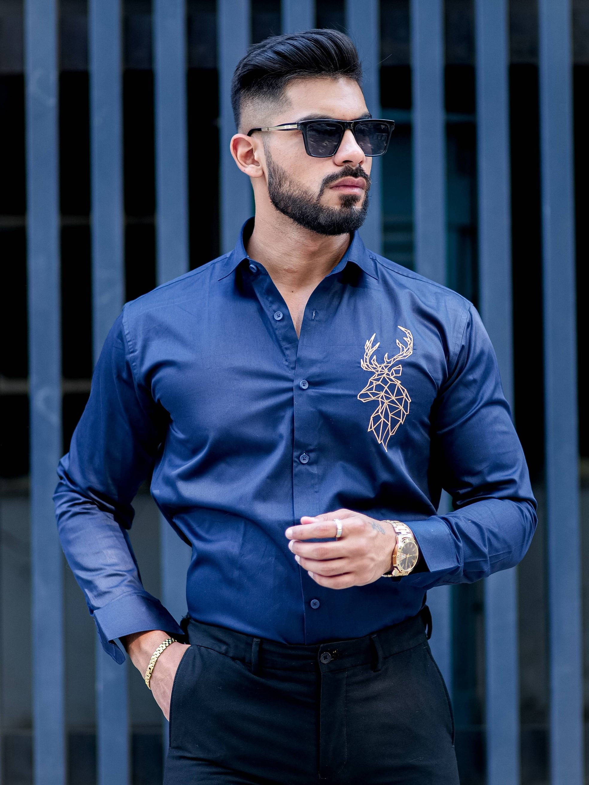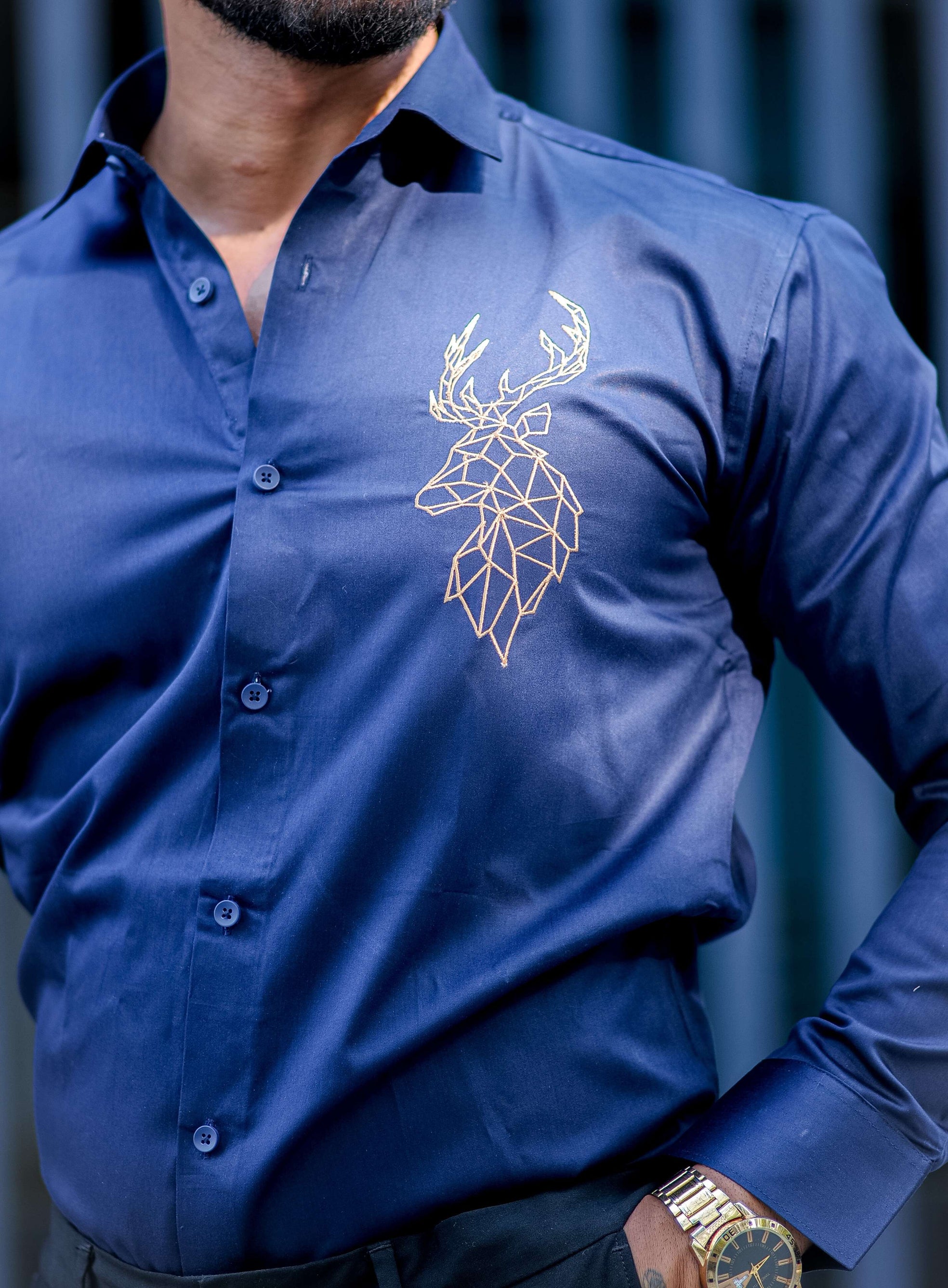 Deer Golden Embroidered Navy Blue Premium Cotton Shirt