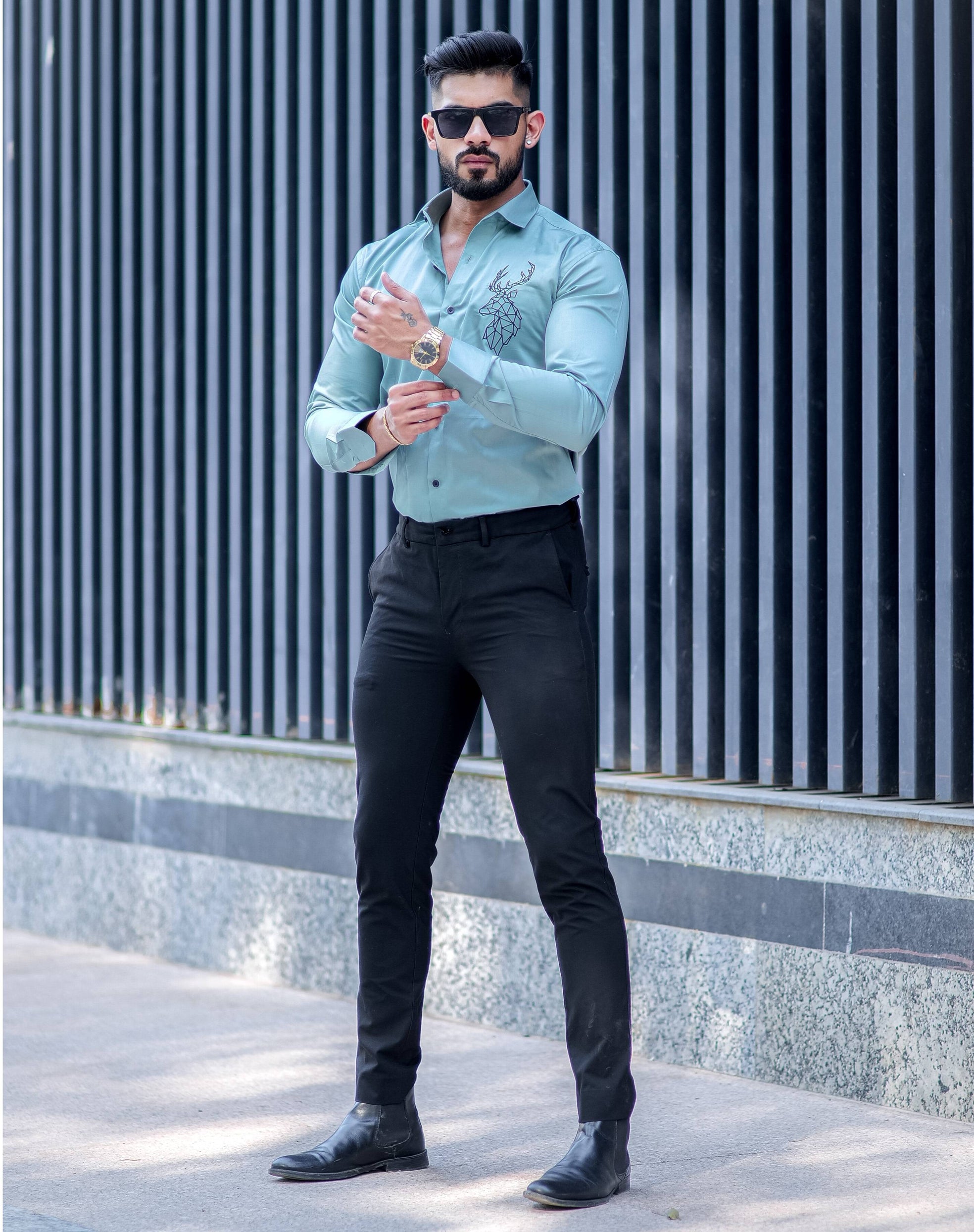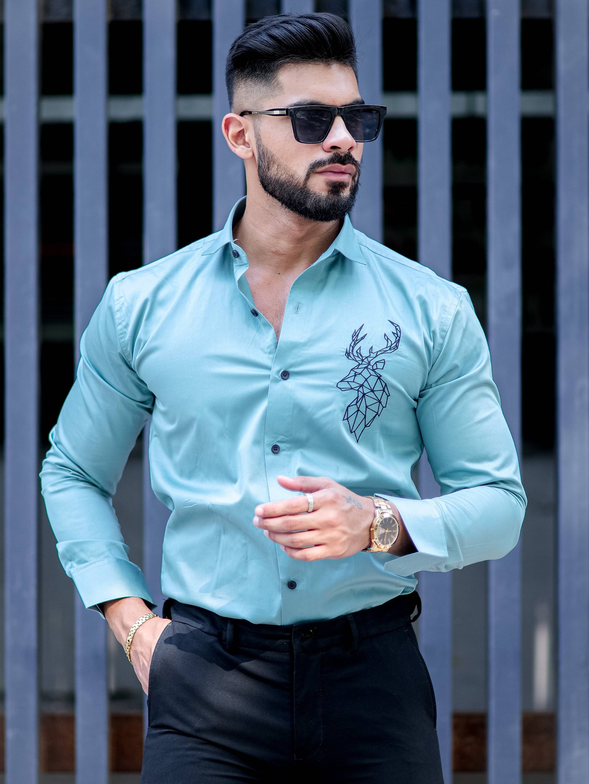 Deer Embroidered Cyan Golden Premium Cotton Shirt