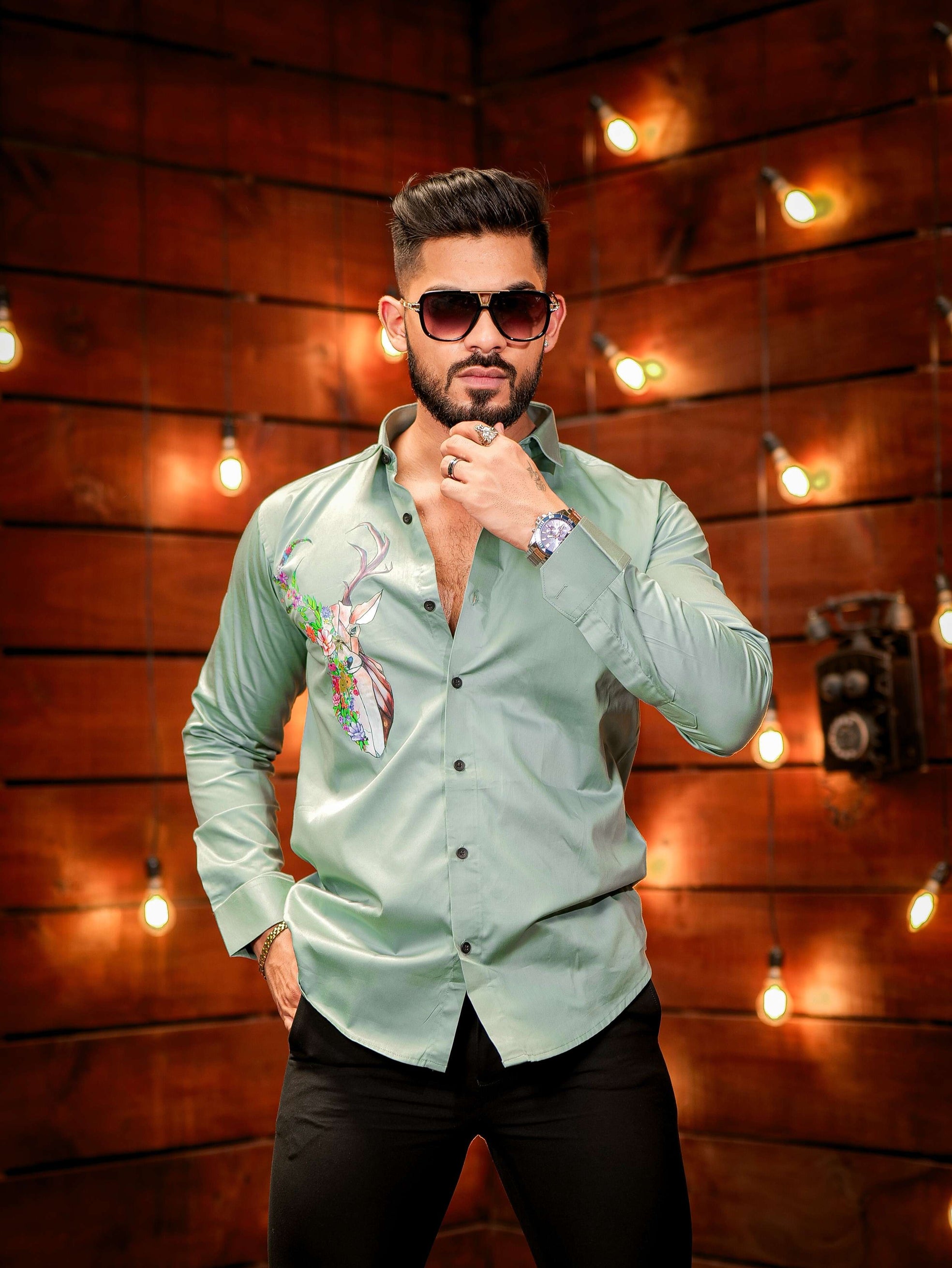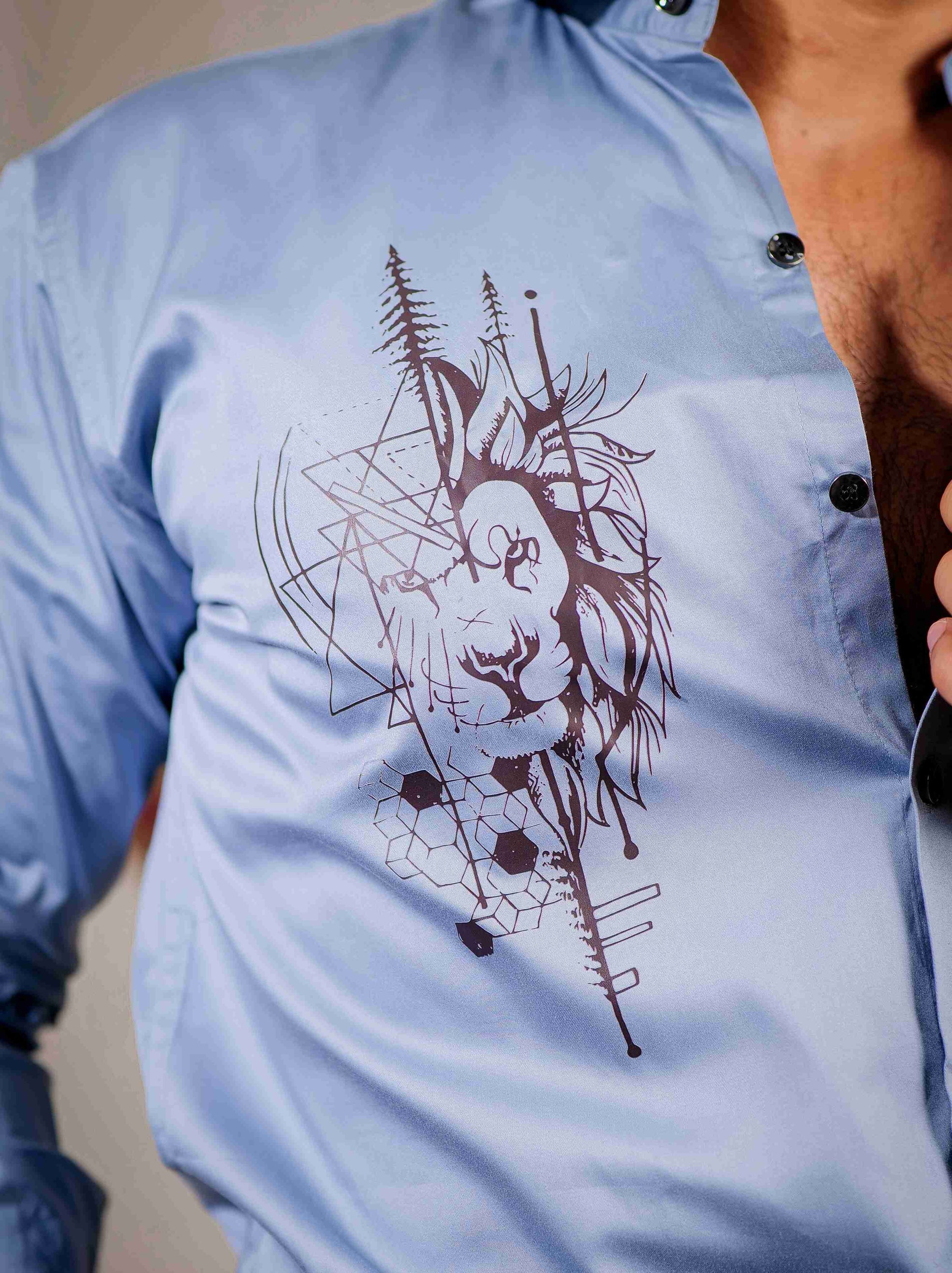 Cyan Color Deer Printed Satin Cotton Shirt