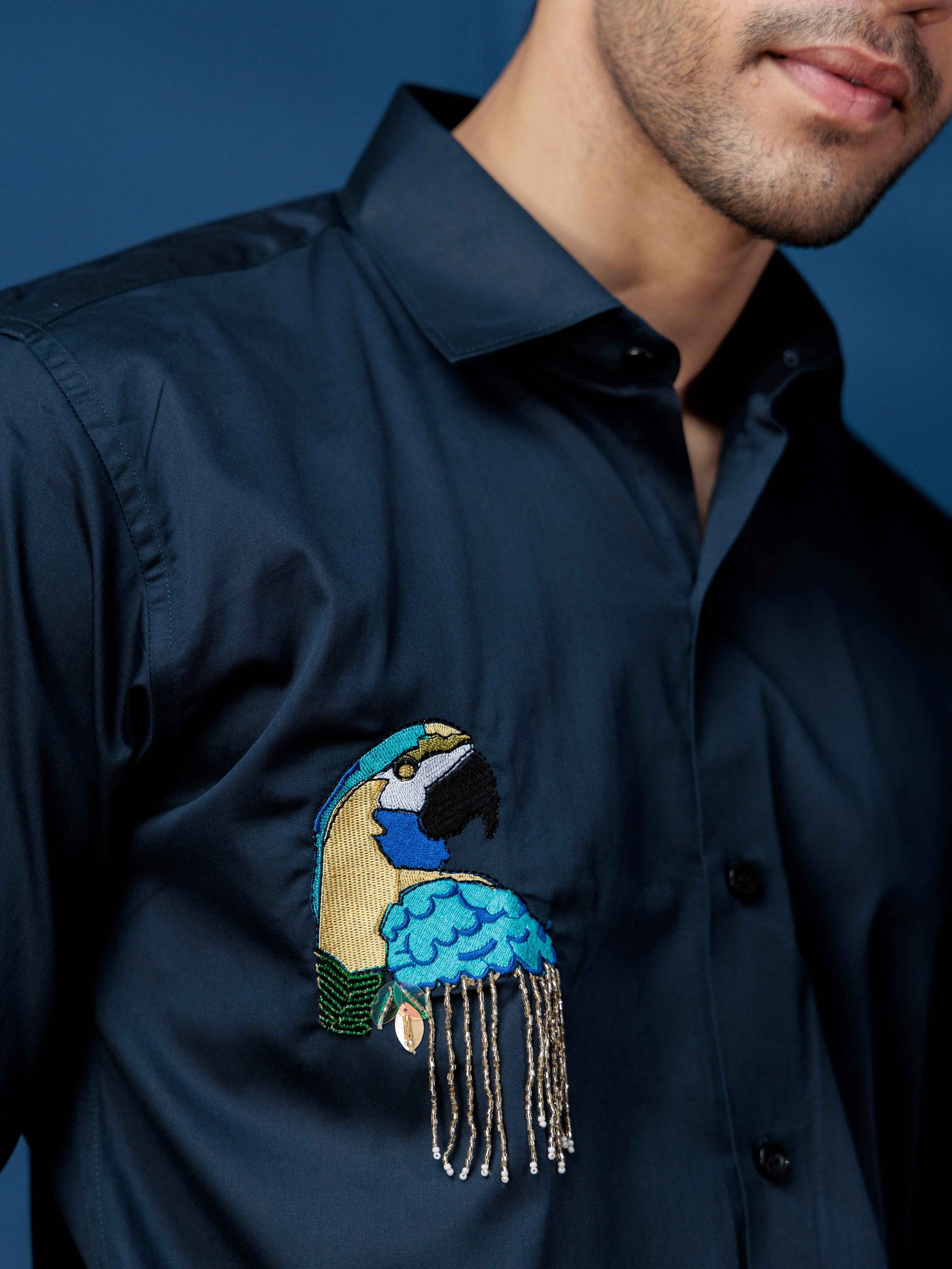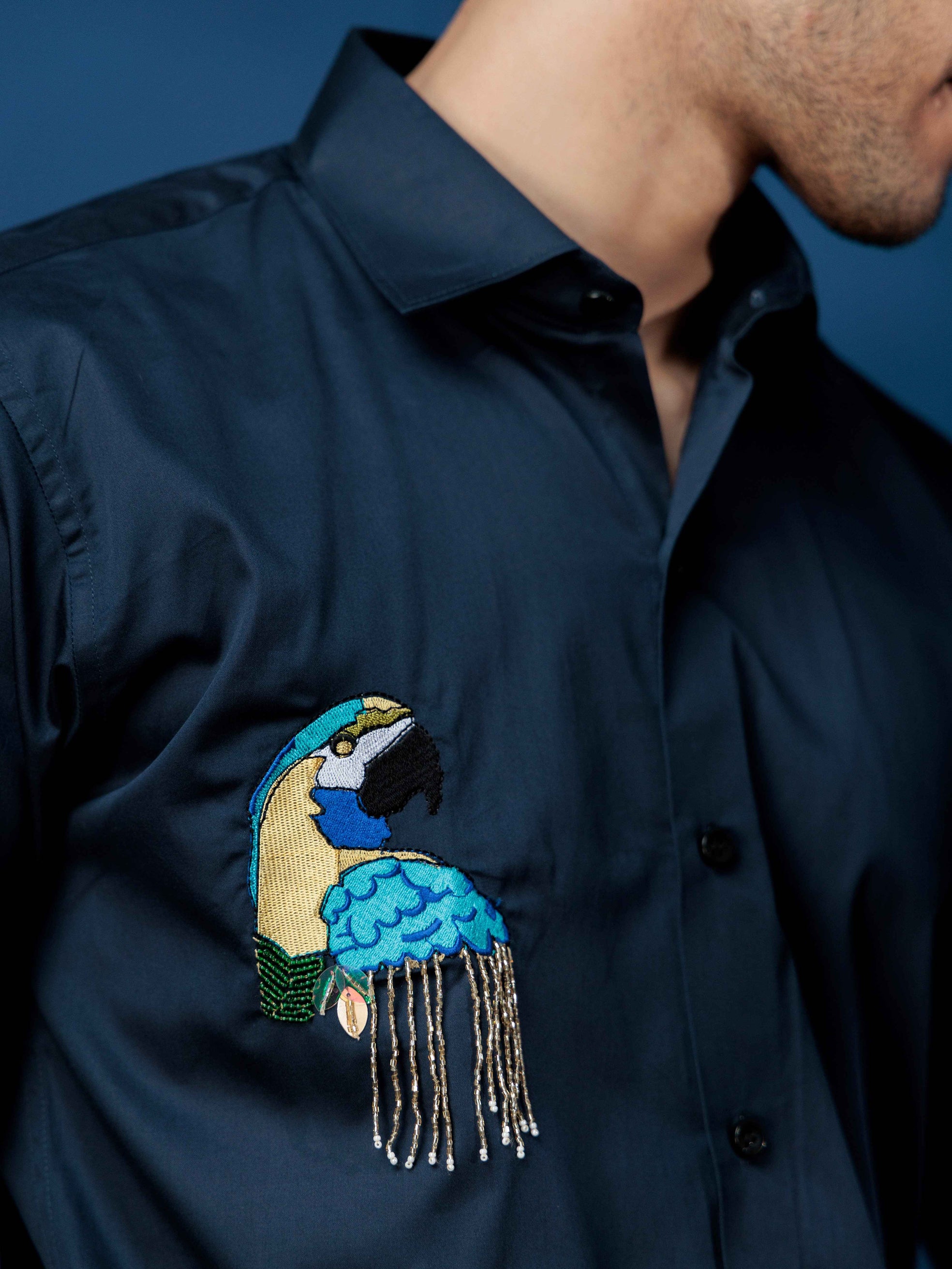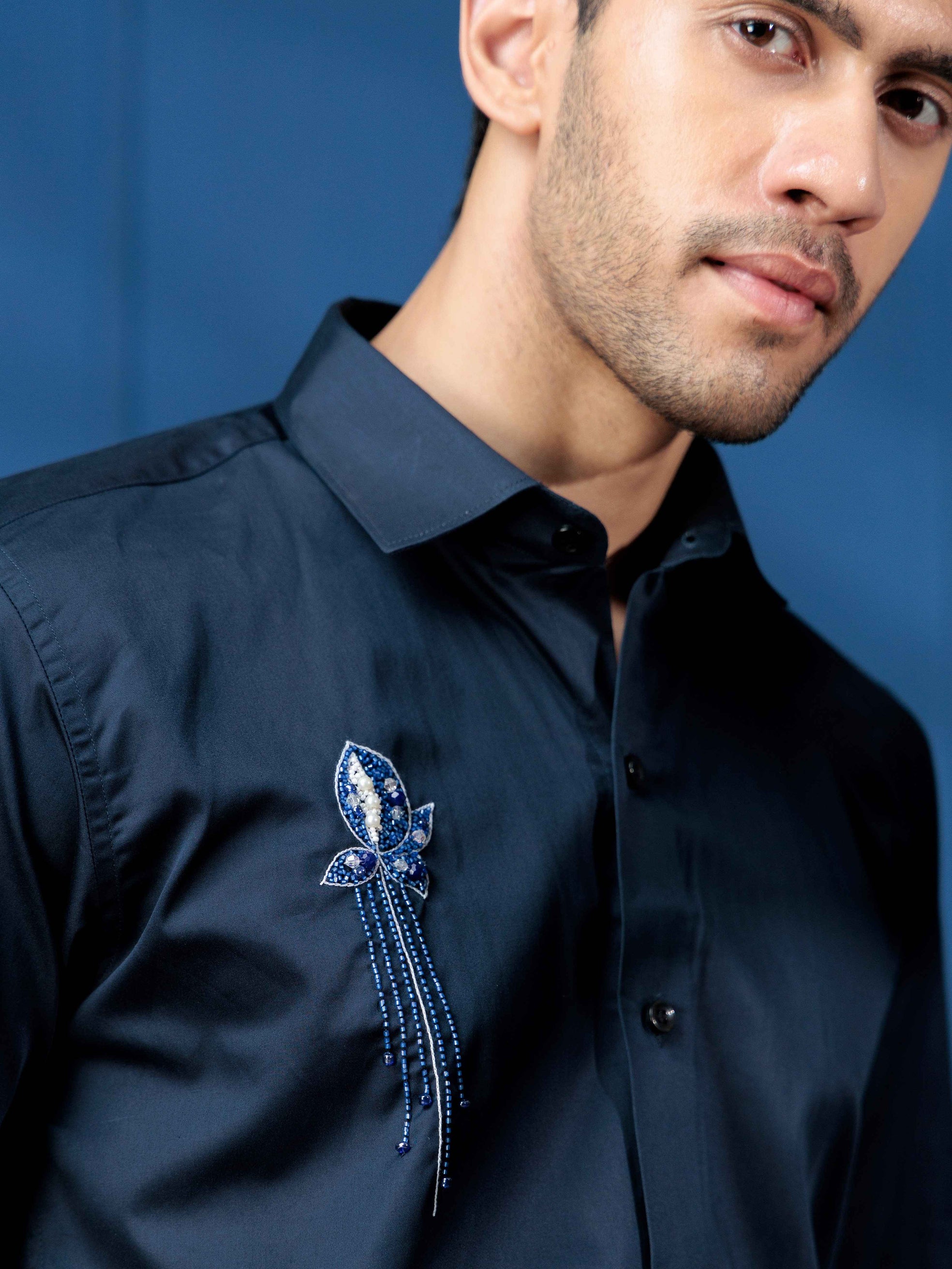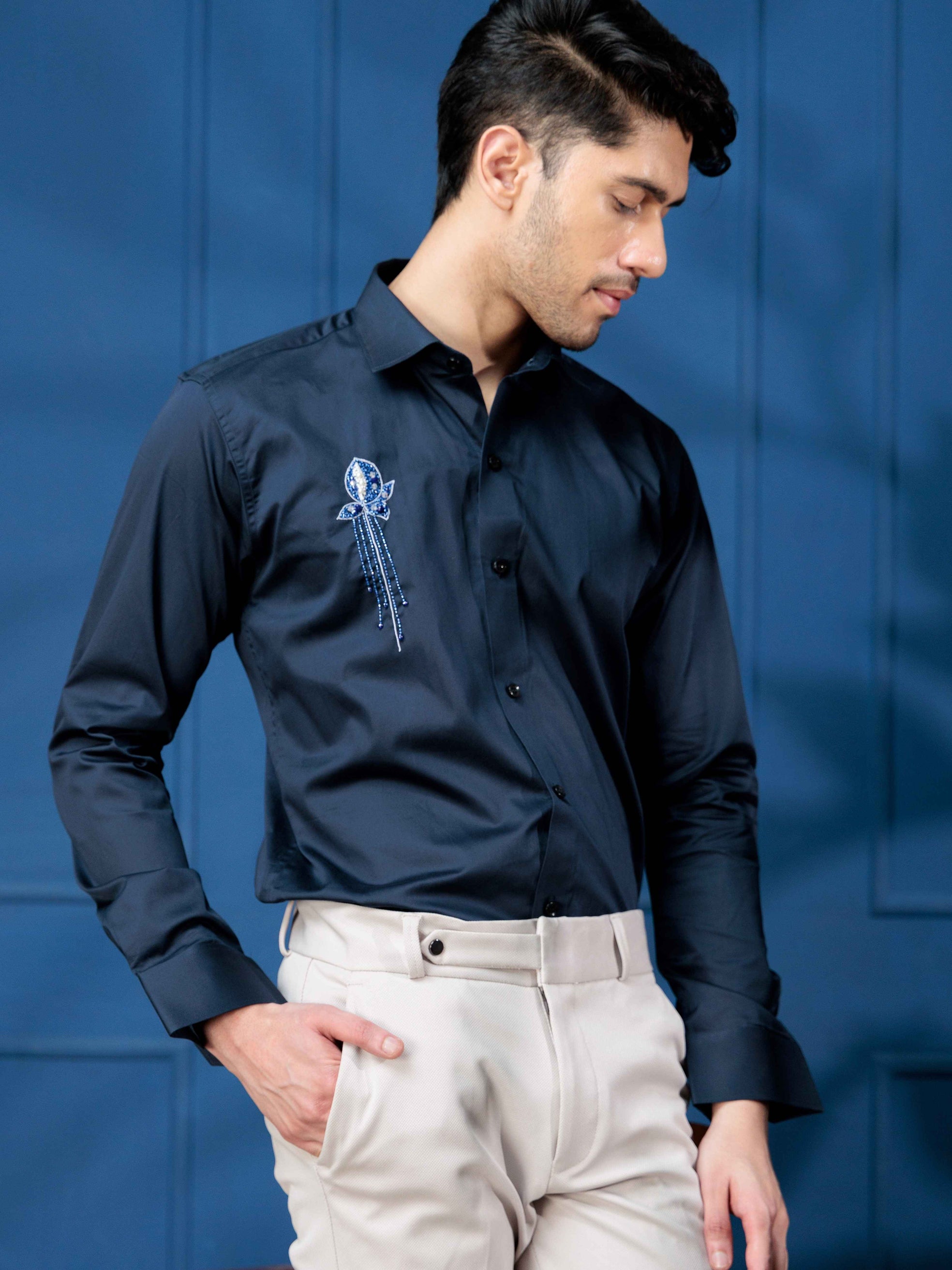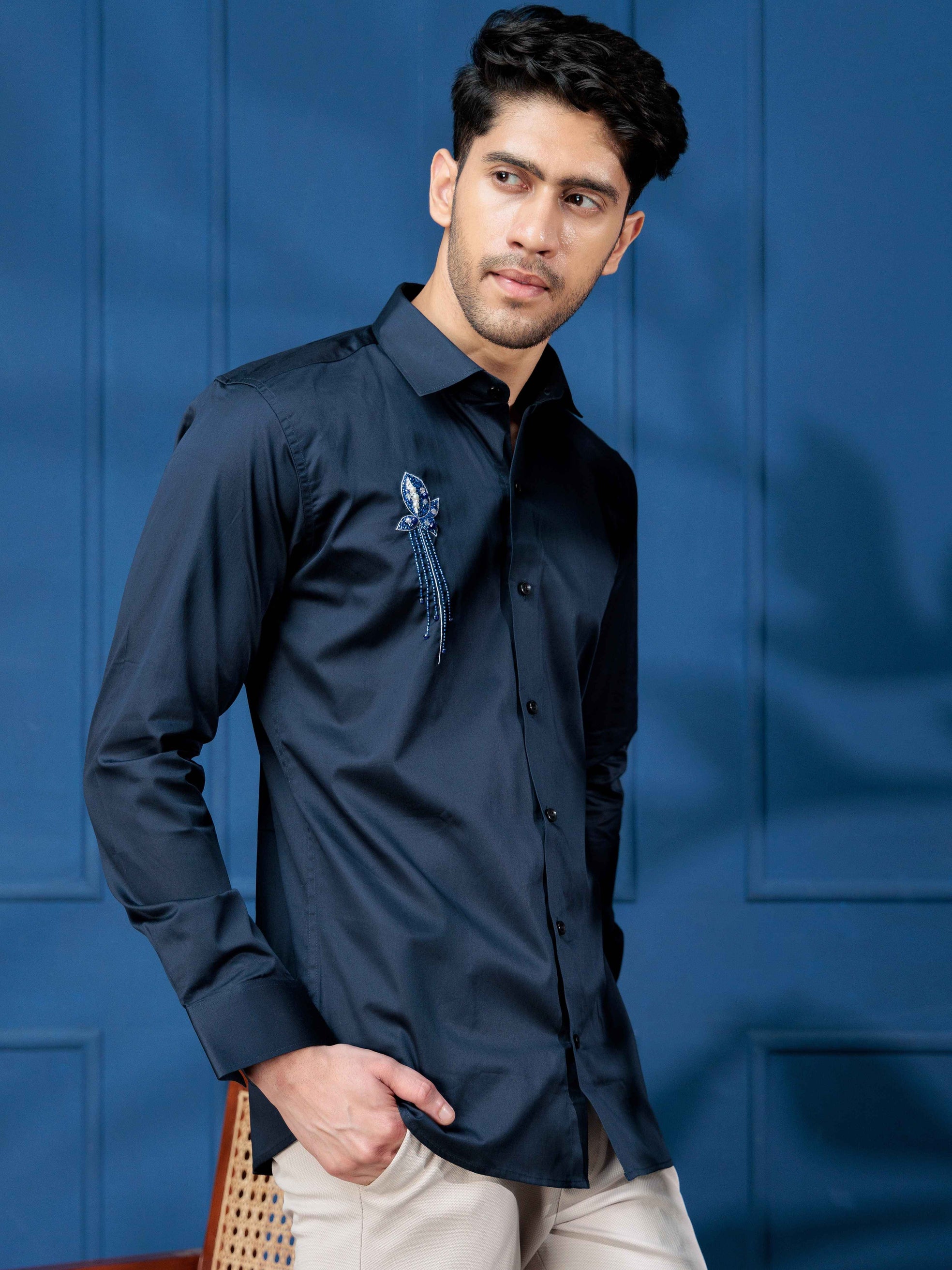 FOOMER NAVY RHINESTONE HAND WORK SATIN COTTON SHIRT FOR MEN