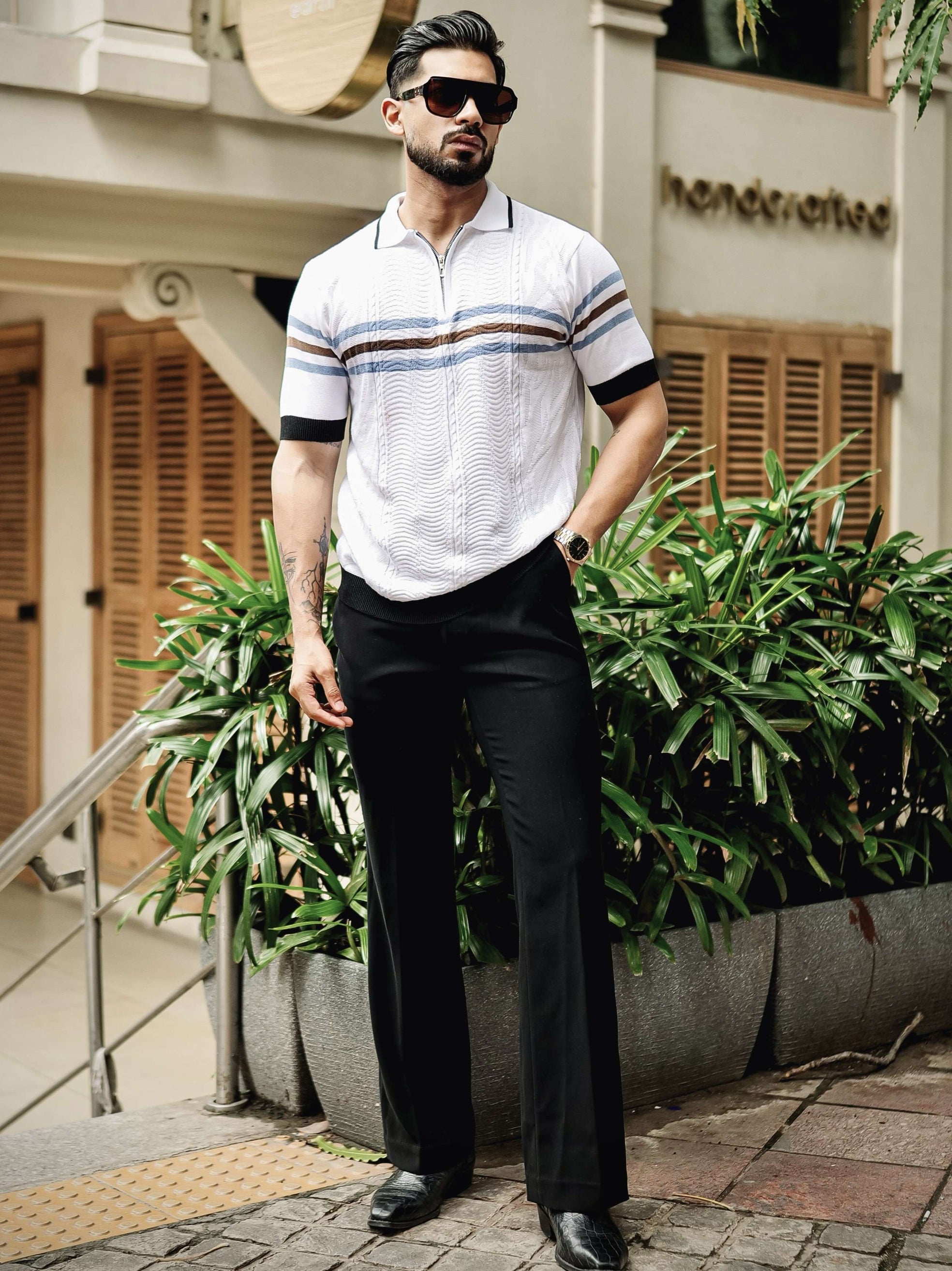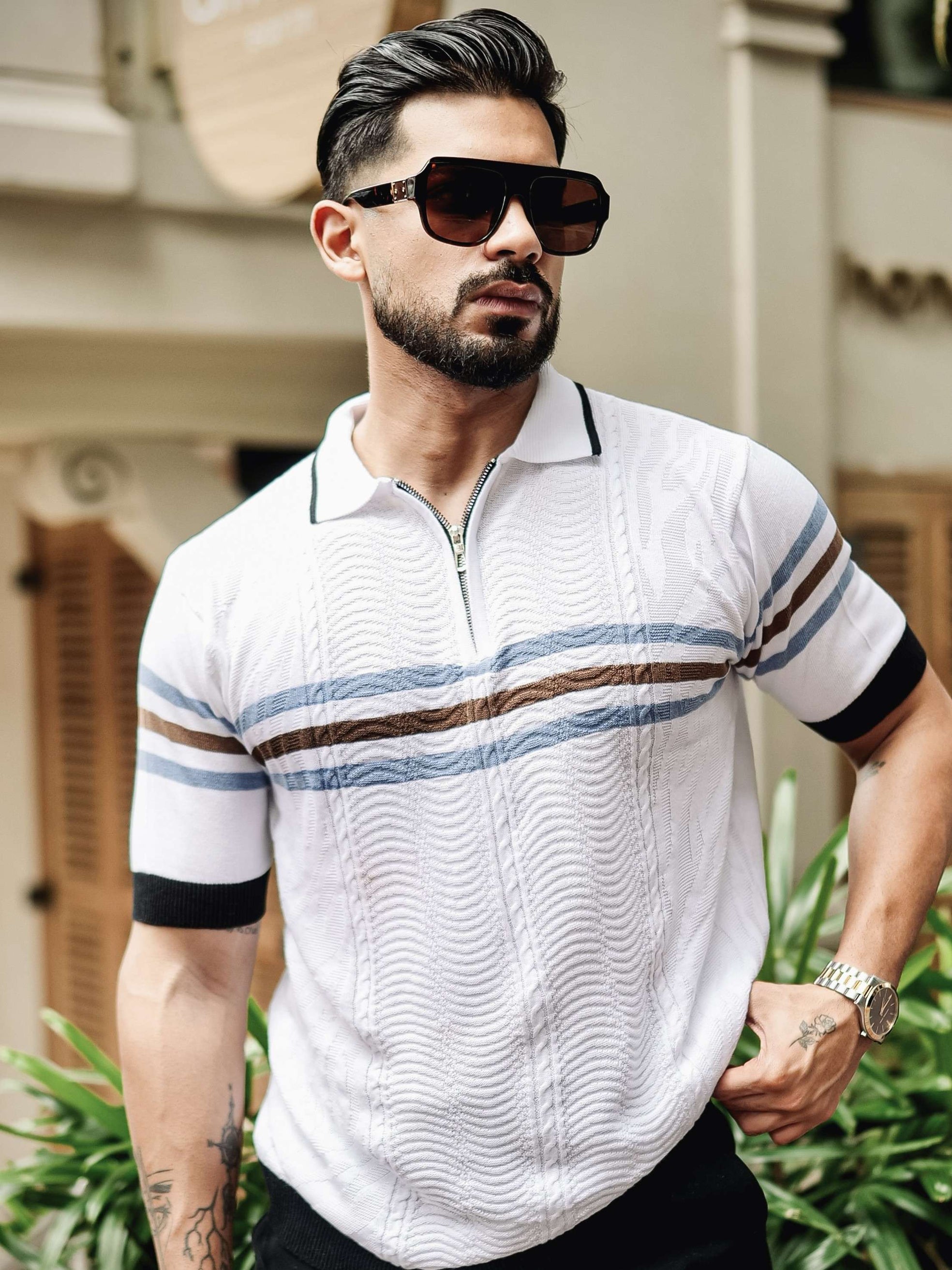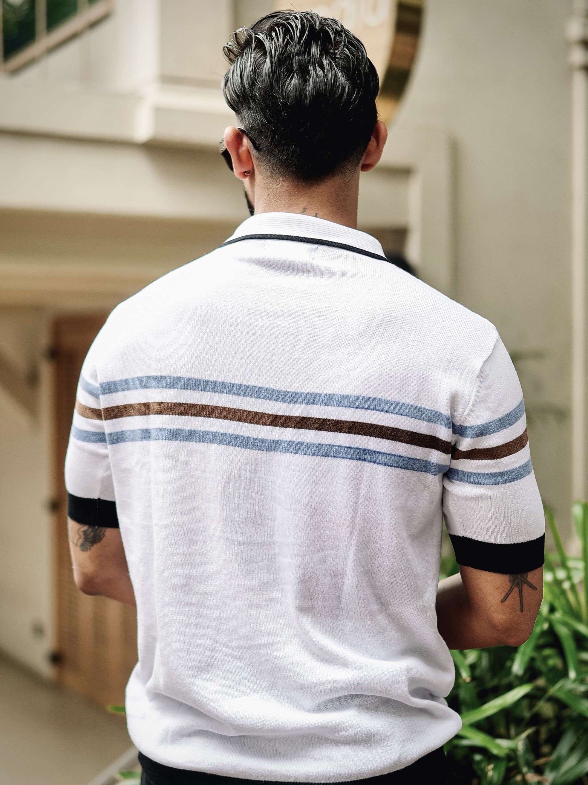 FOOMER WHITE AND NAVY HALF SLEEVE KNITTED TSHIRT FOR MEN'S