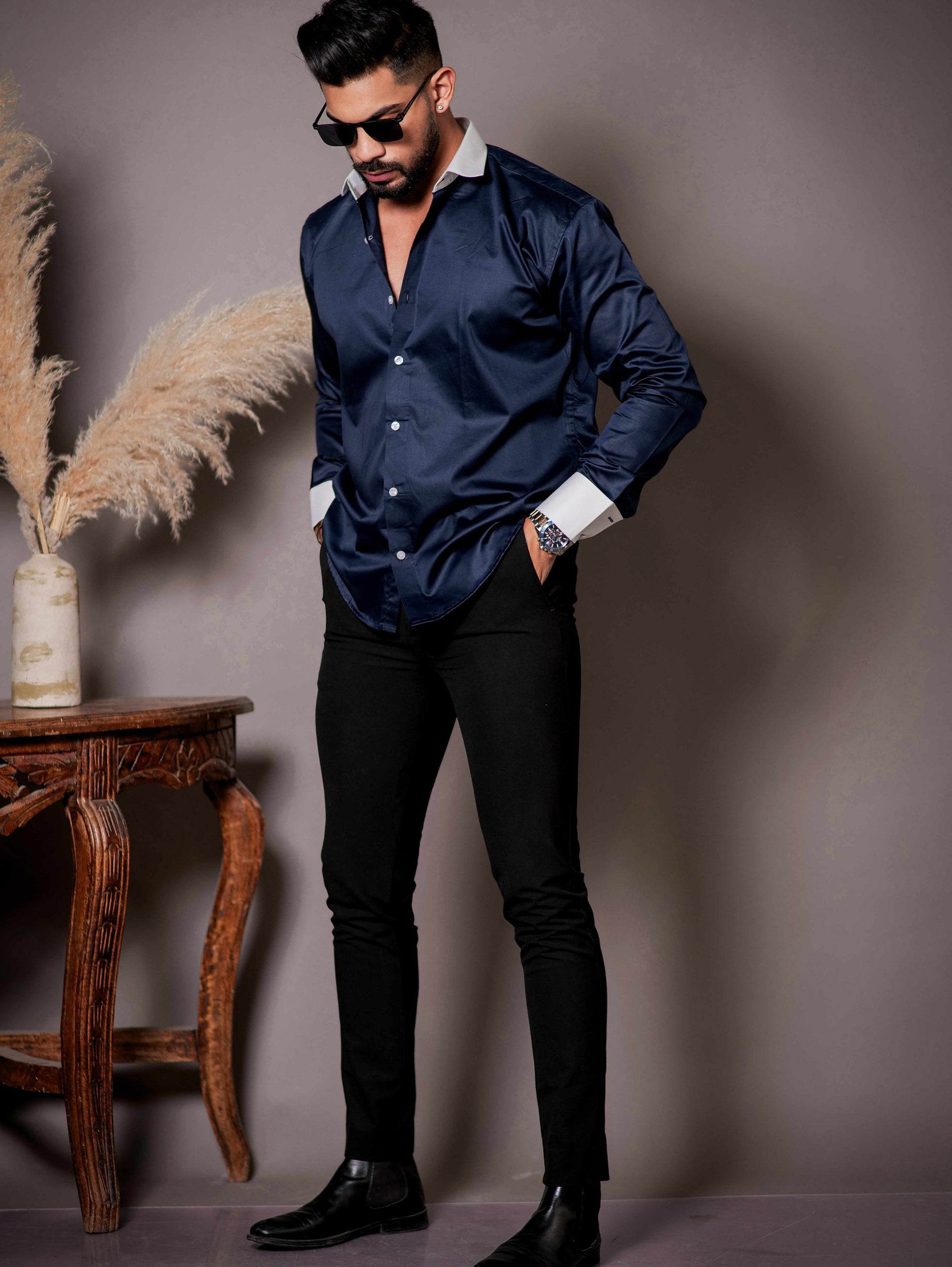 Formy Navy Luxury Satin Cotton Shirt For Men's