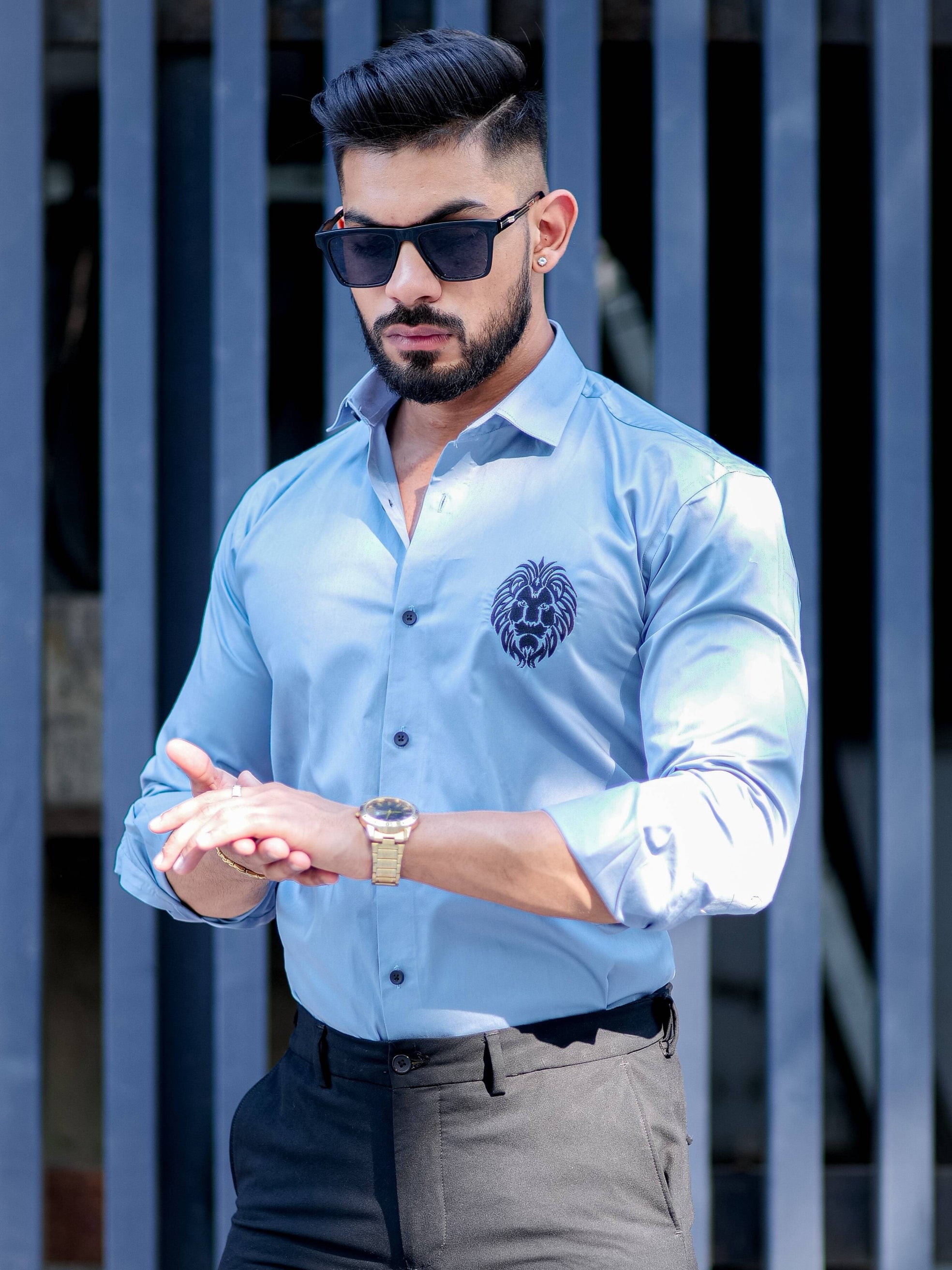 Horse Golden Embroidered Blue Premium Shirt For Men