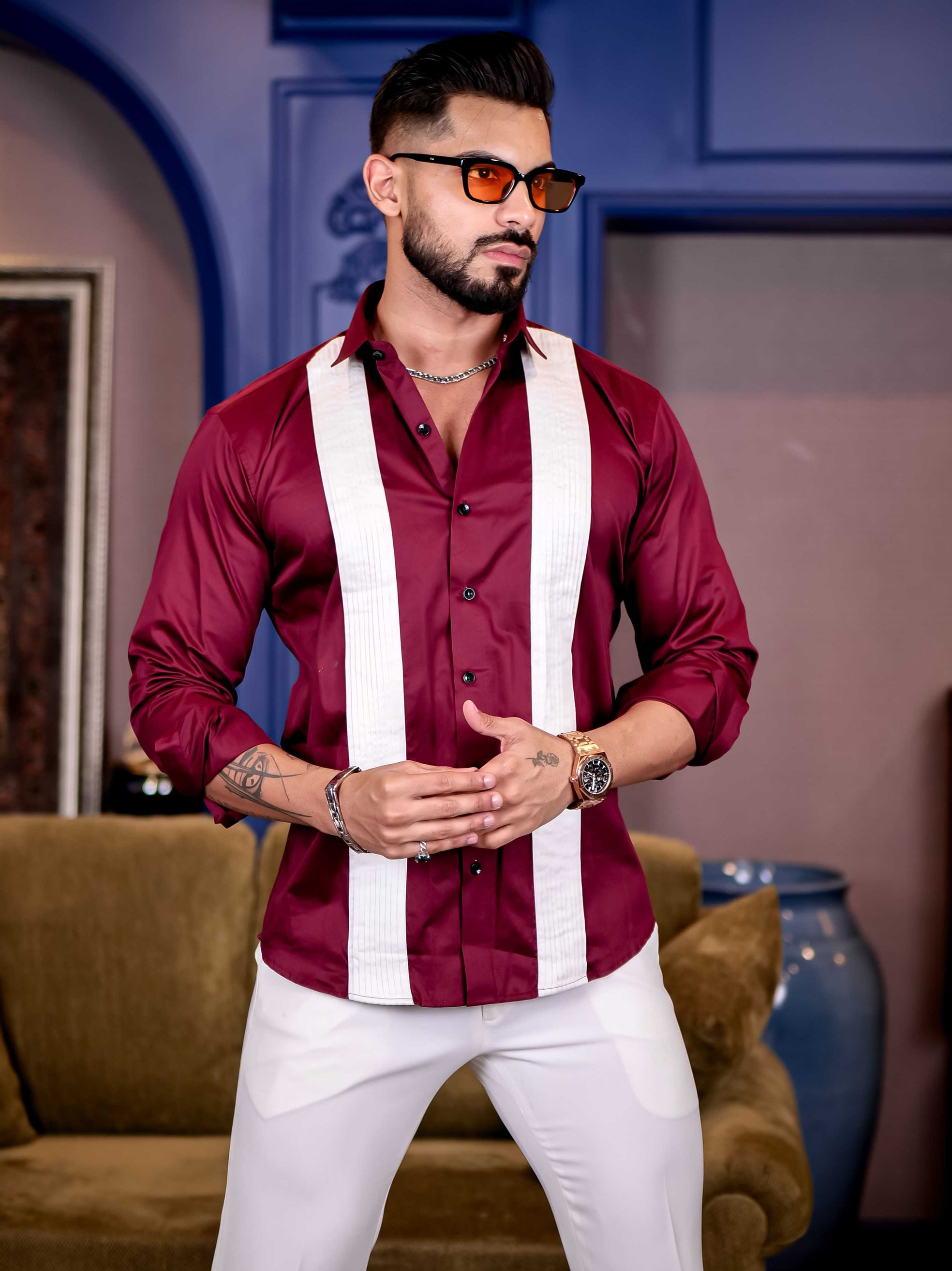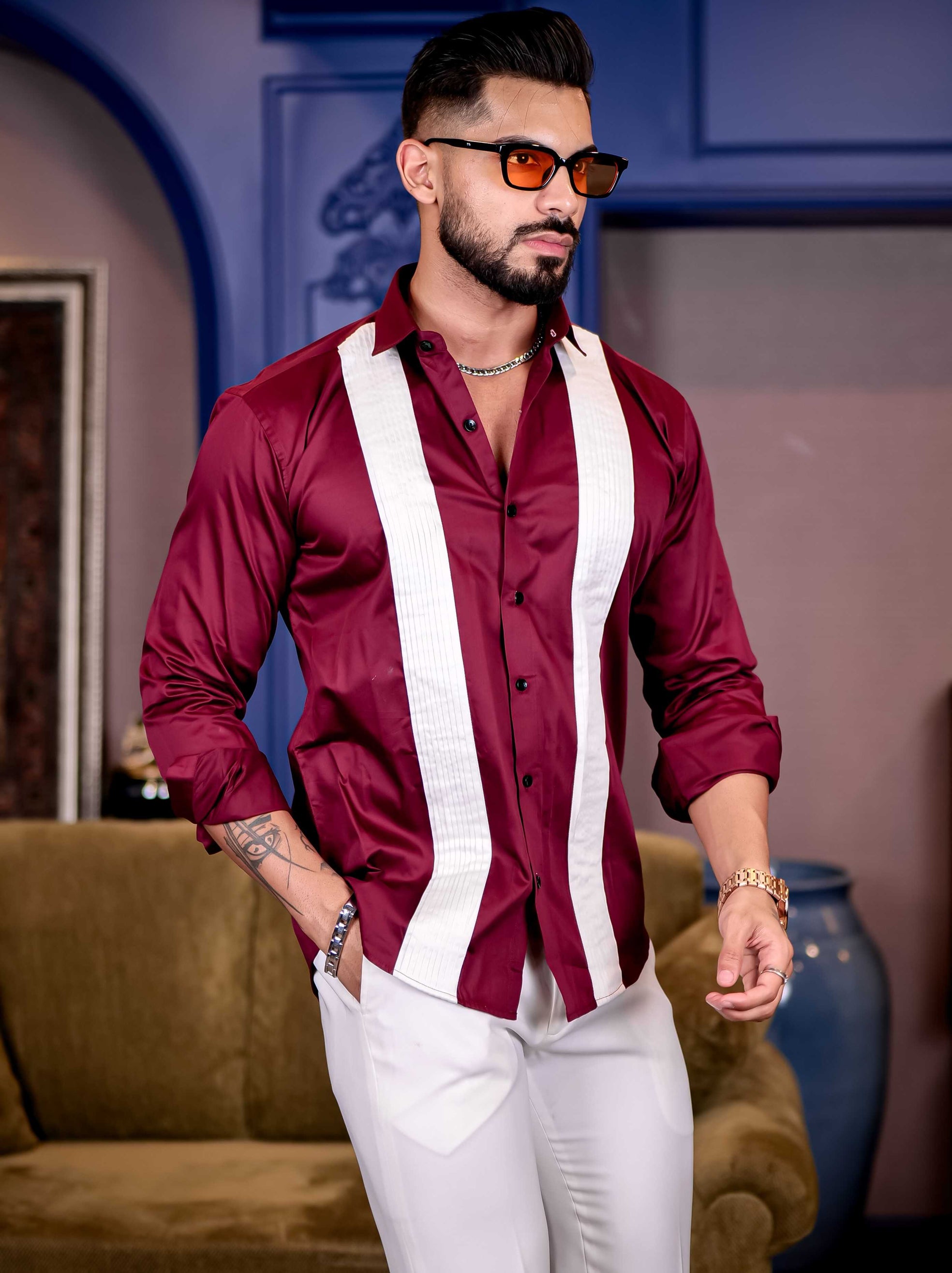 Maroon with White Subtle Sheen Tuxedo Premium Giza Satin Cotton Shirt