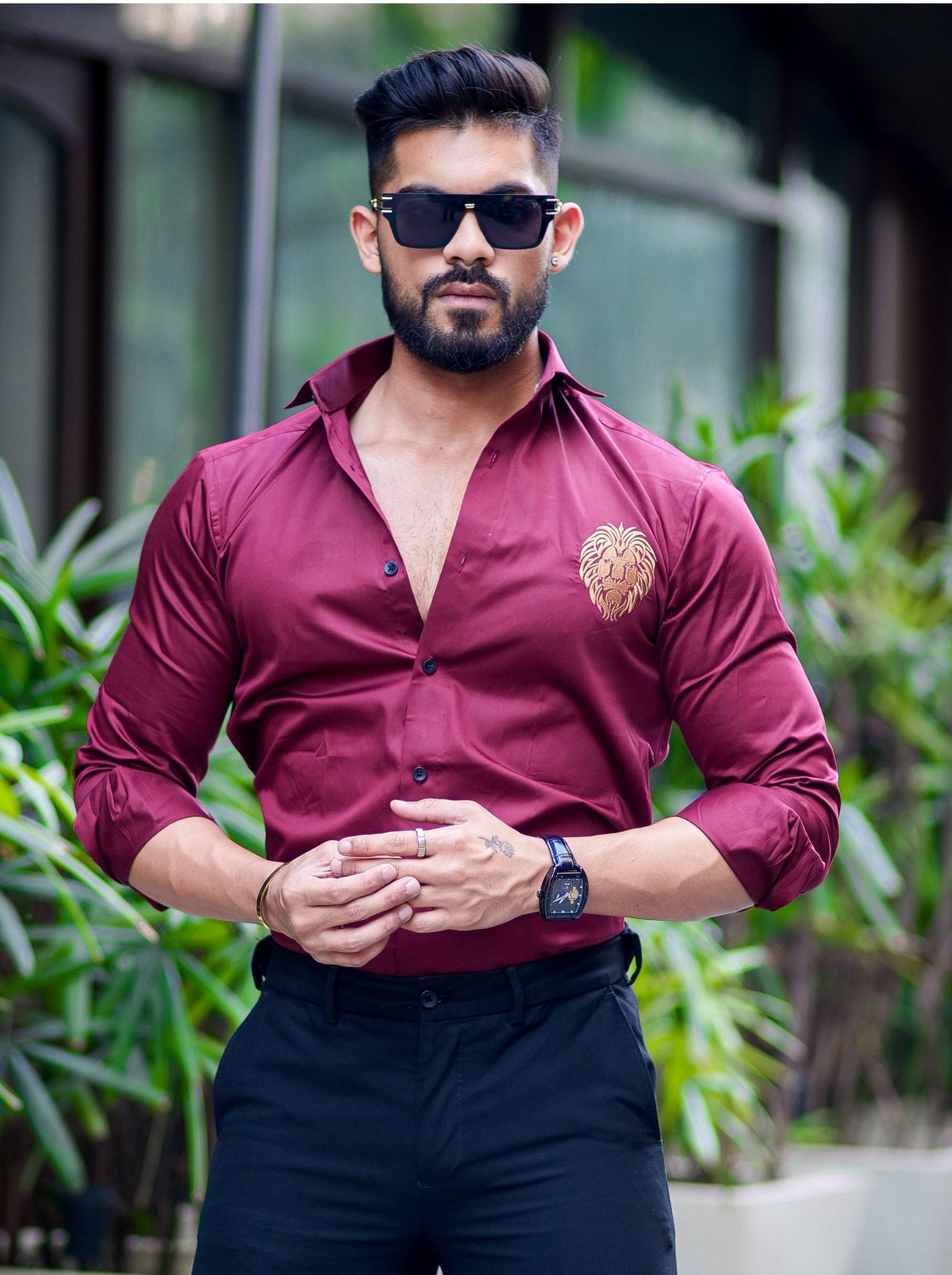 Maroon Golden Embroidered Mufasa Luxury Shirt For Men's
