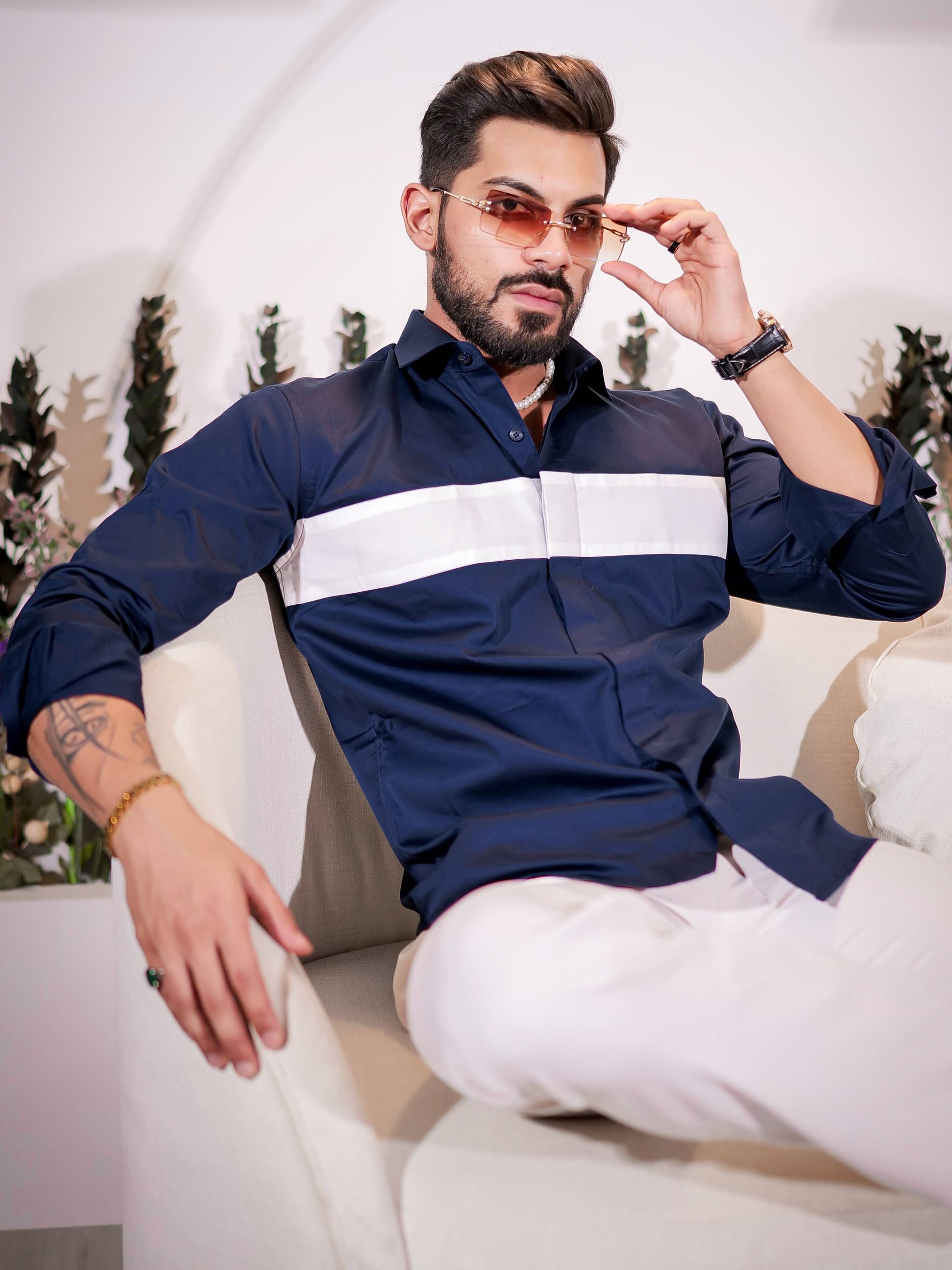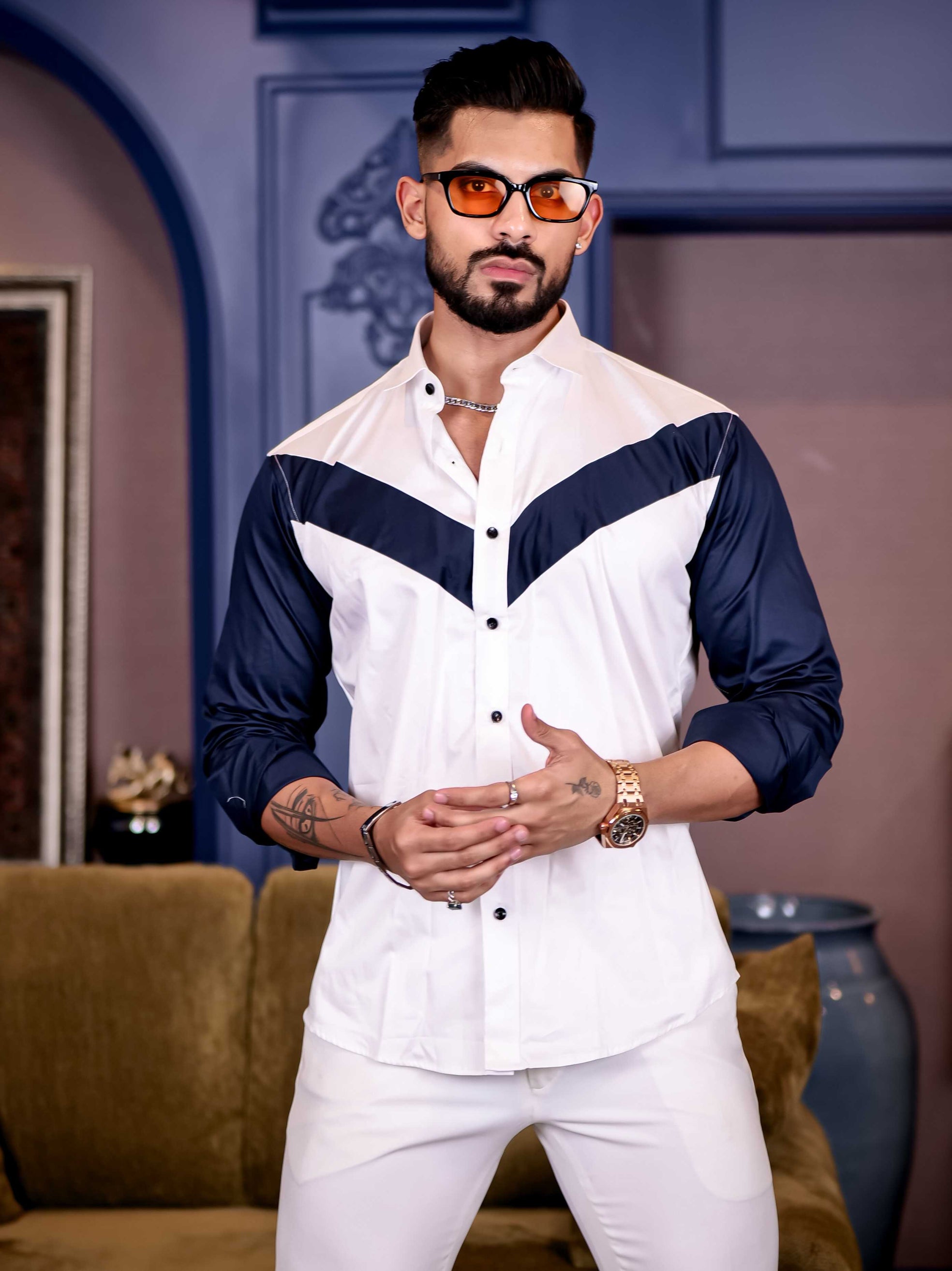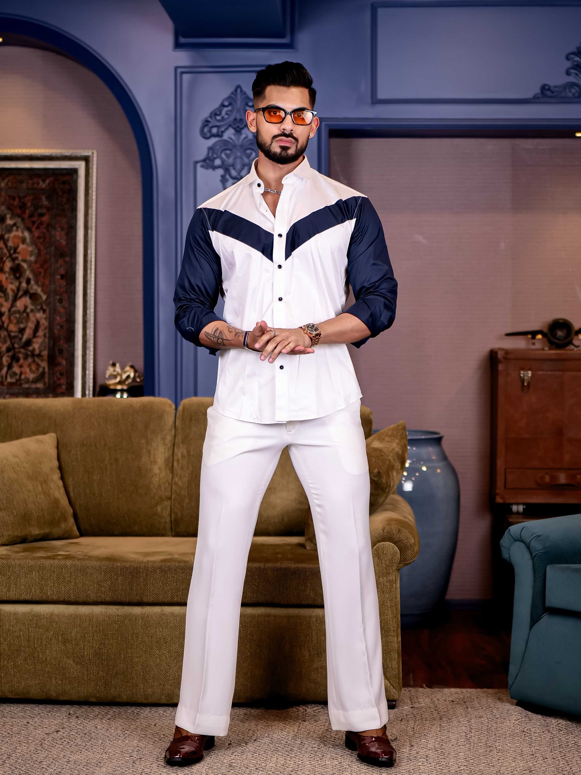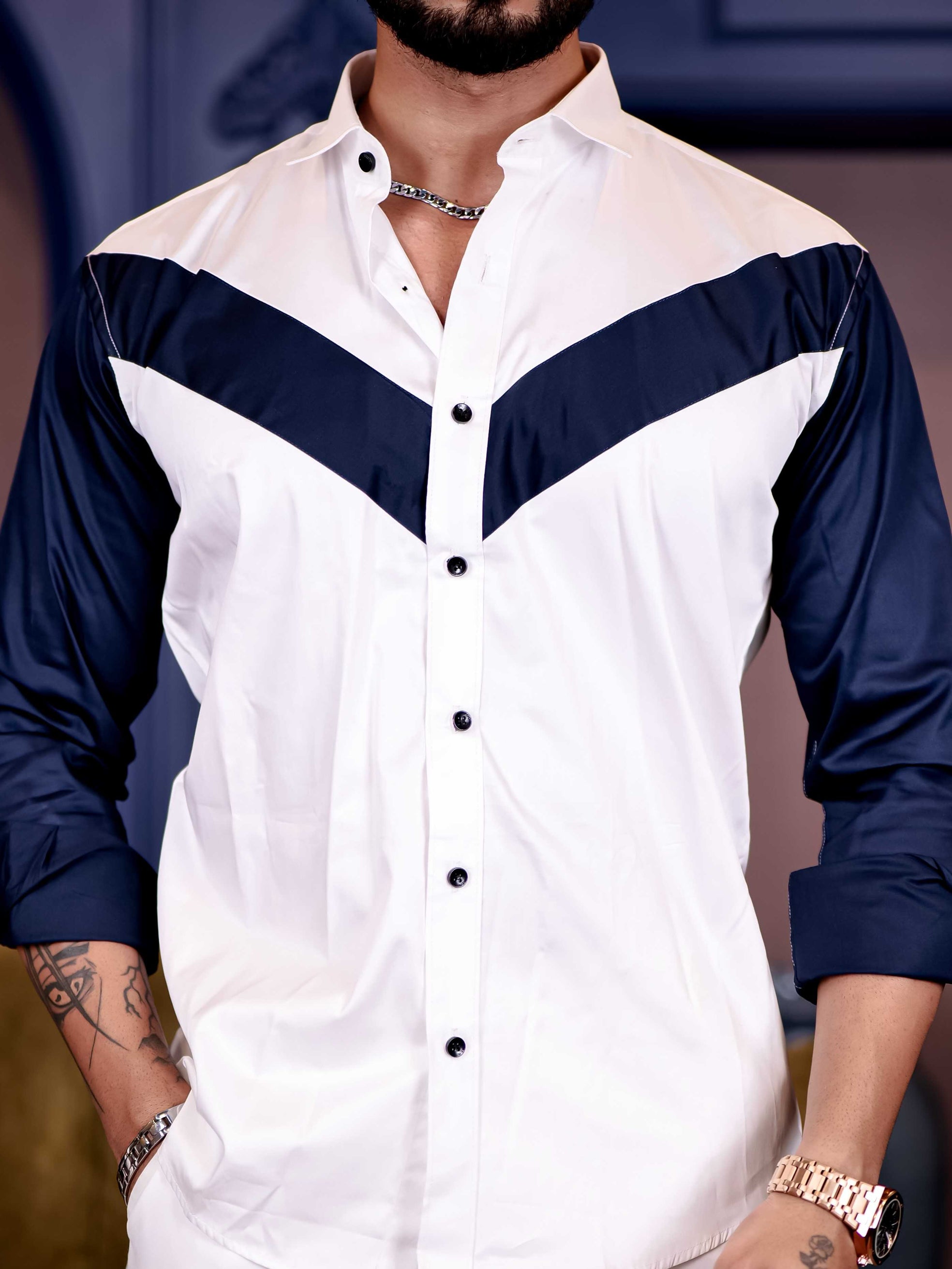 White and Navy Cut n sew Premium Cotton Shirt For Men