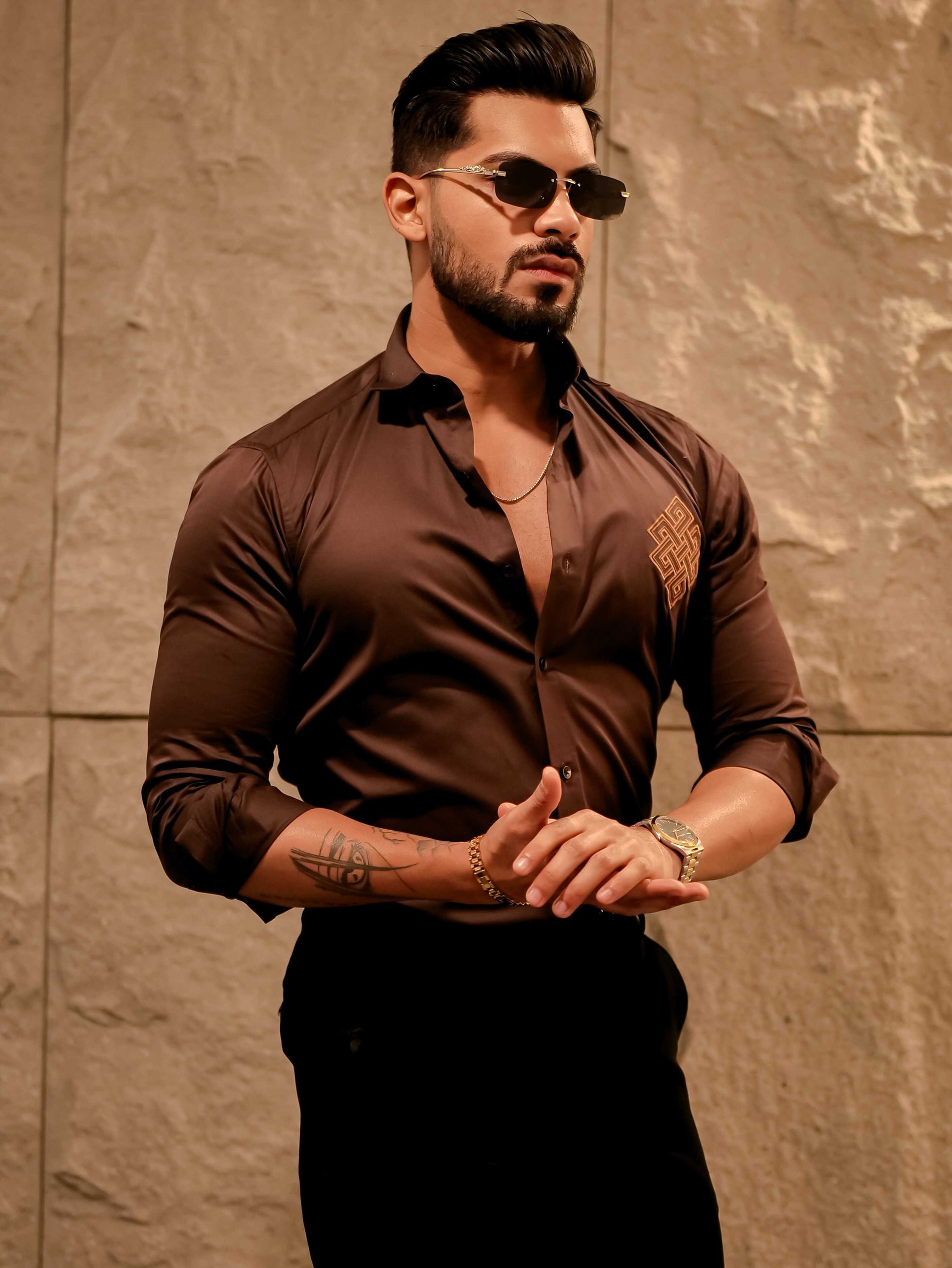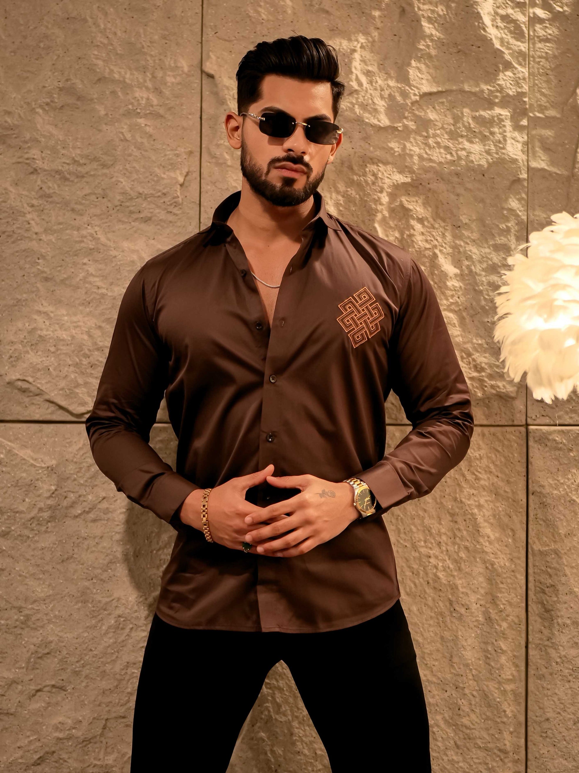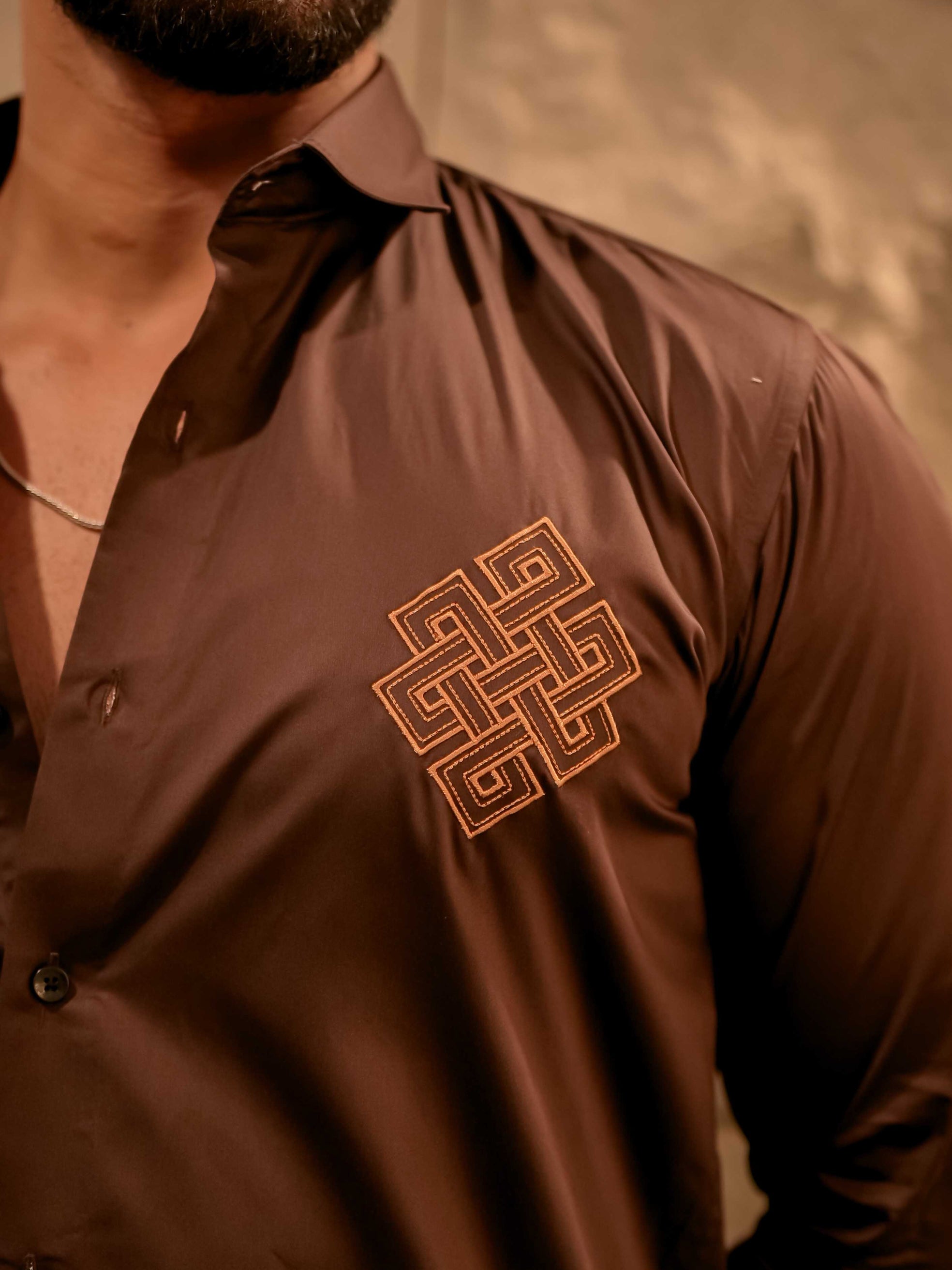 Aesthetic Brown Golden Embroidered Premium Cotton Shirt For Men
