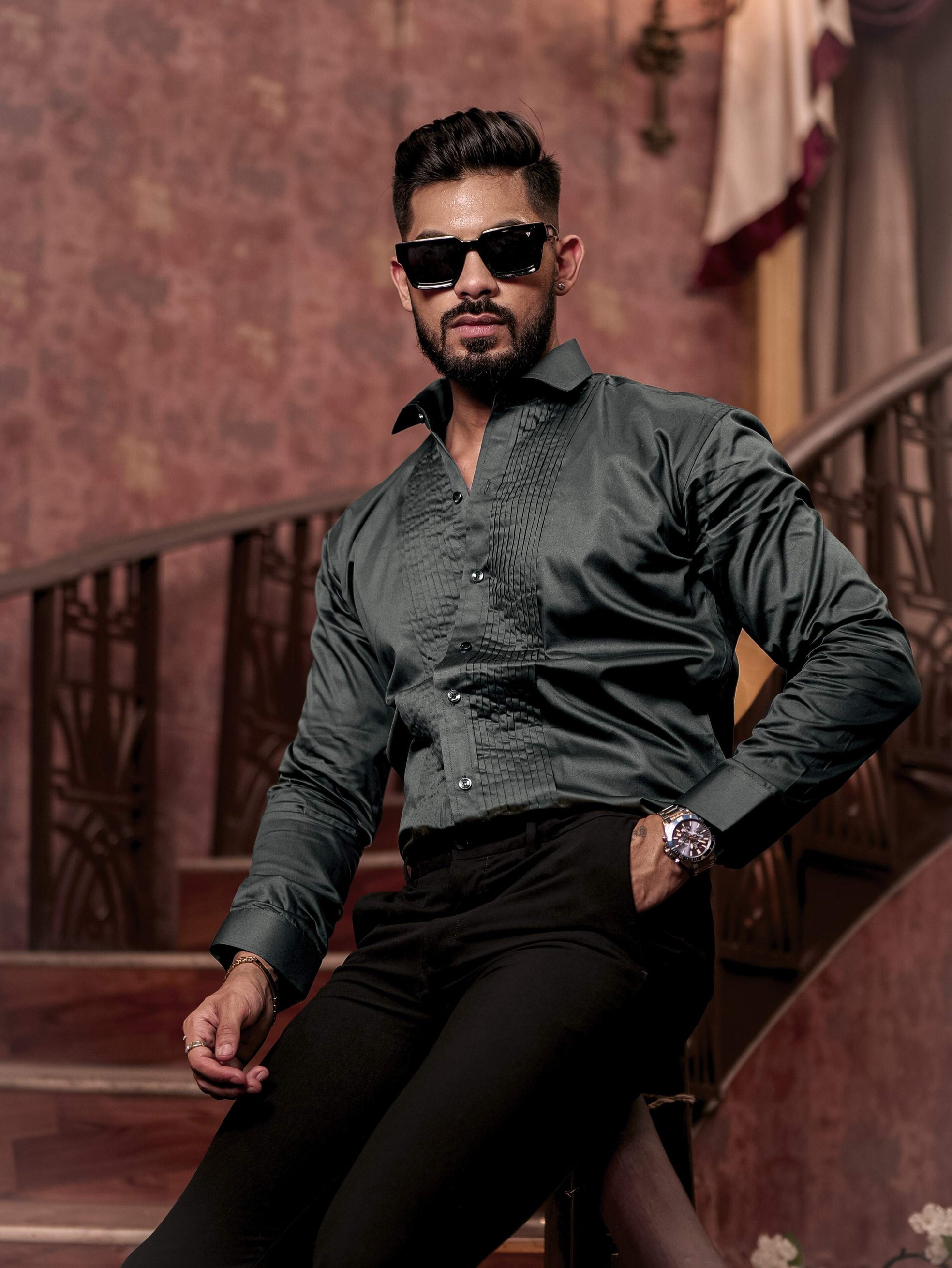 Olive Green Subtle Sheen Tuxedo Premium Giza Satin Cotton Shirt