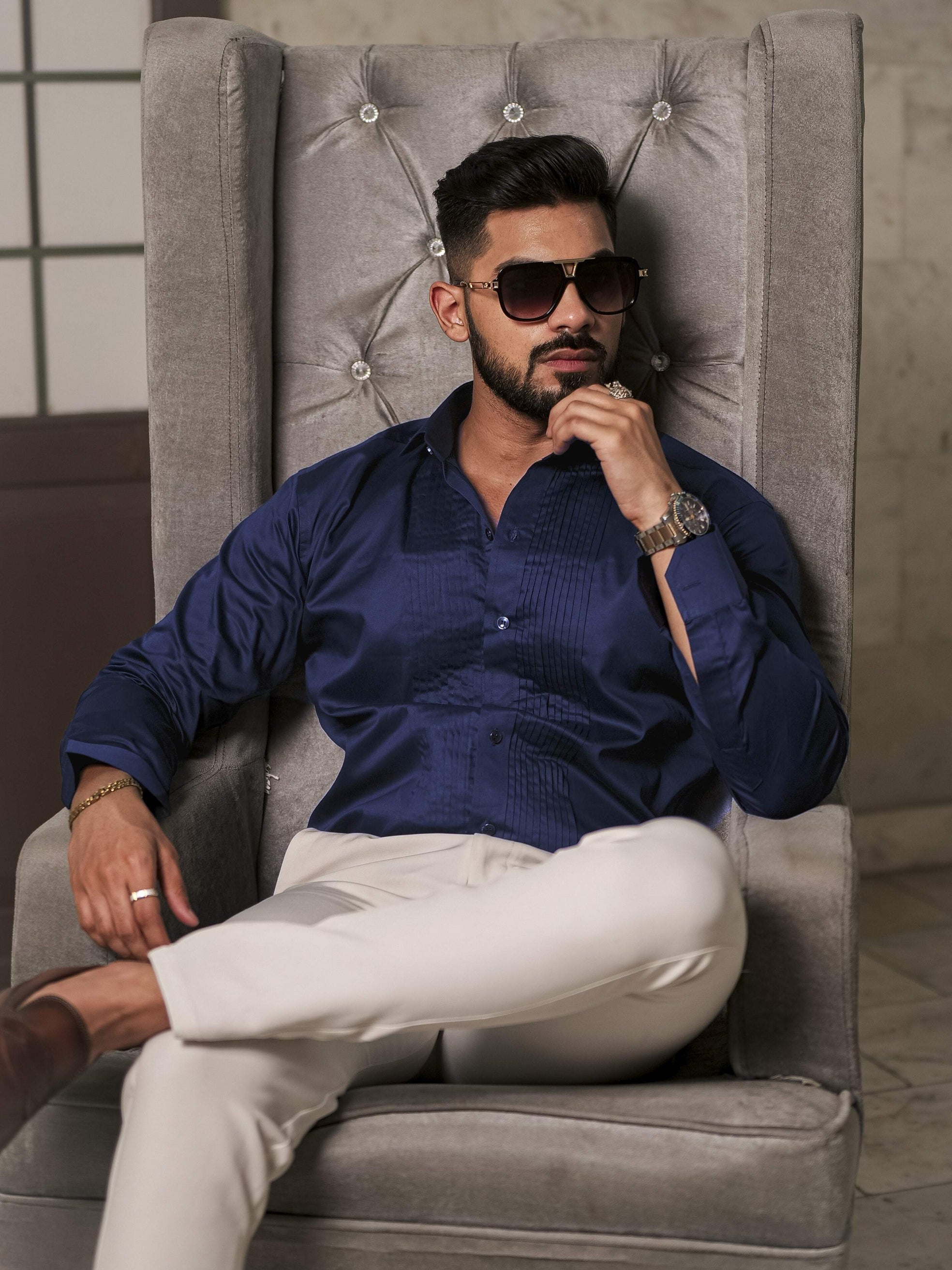 Navy Blue Subtle Sheen Tuxedo Premium Giza Satin Cotton Shirt