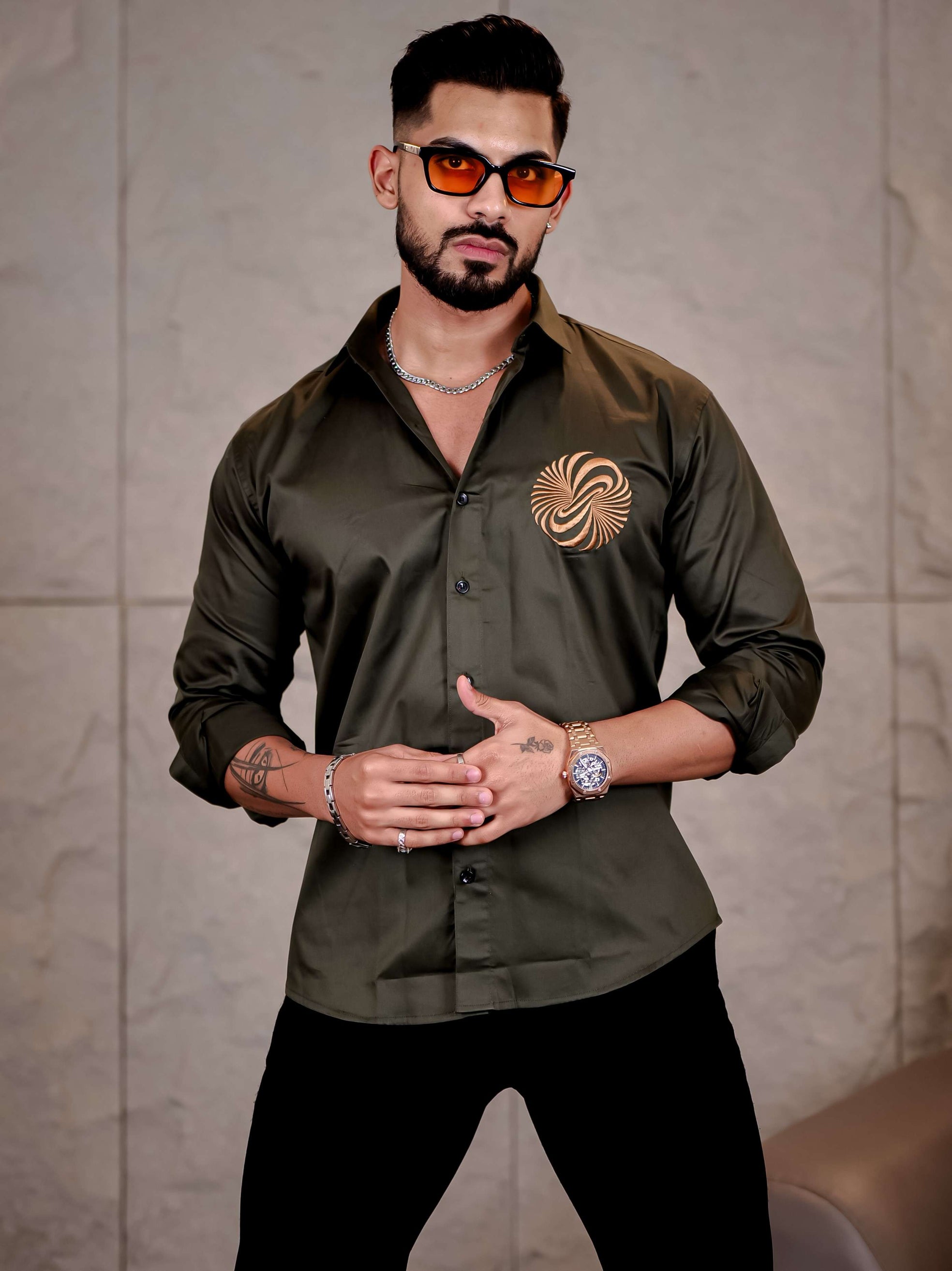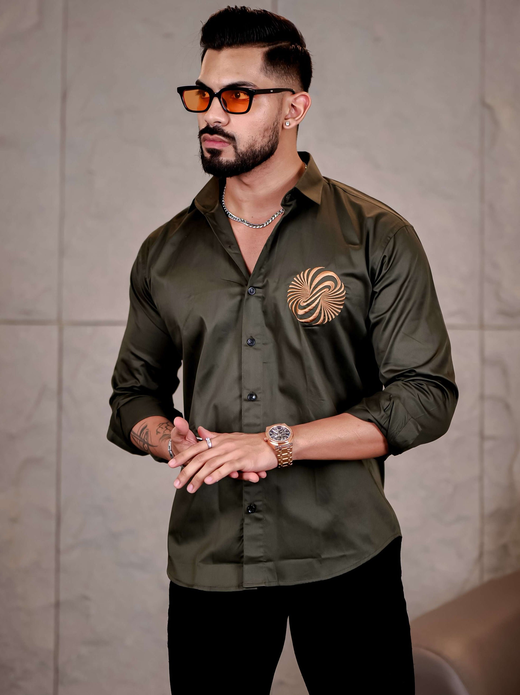 Olive Green Money Attract Embroidered Premium Cotton Shirt For Men