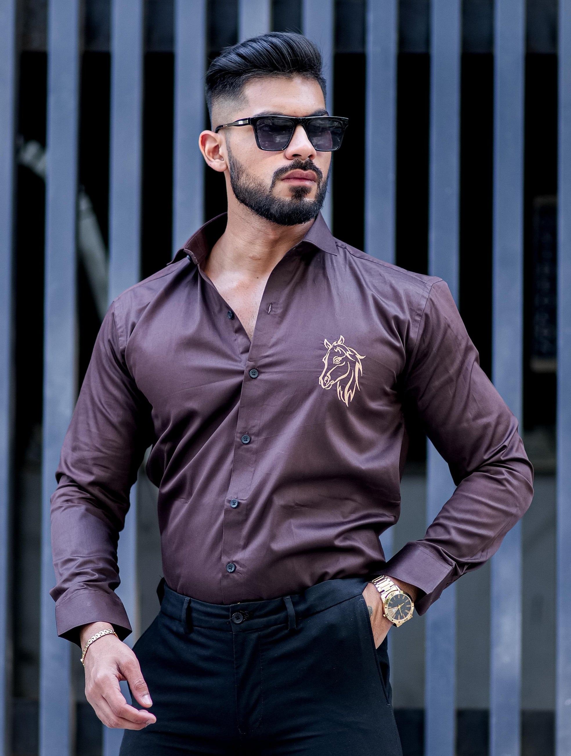 Horse Embroidered Brown Premium Cotton Shirt For Men