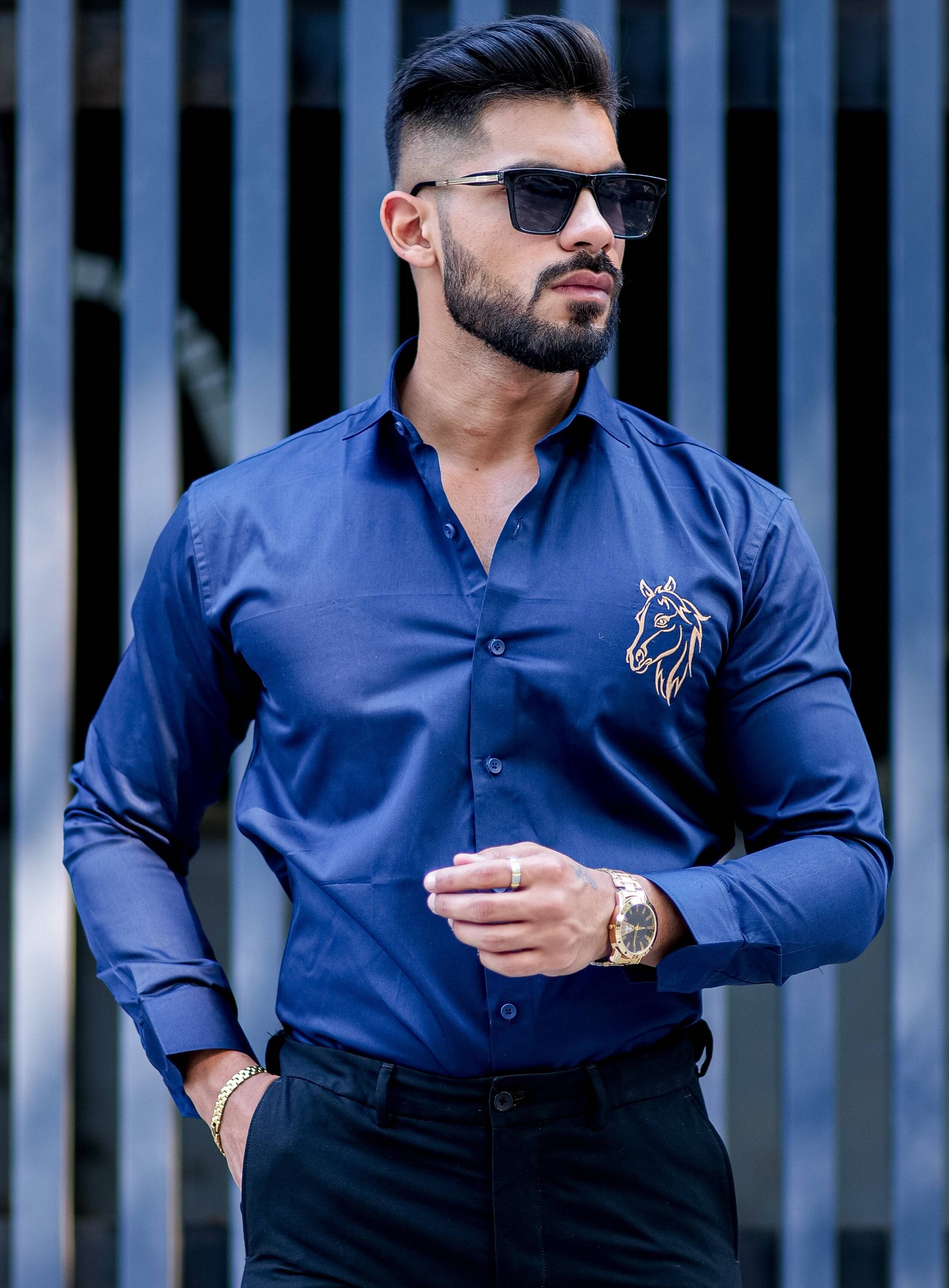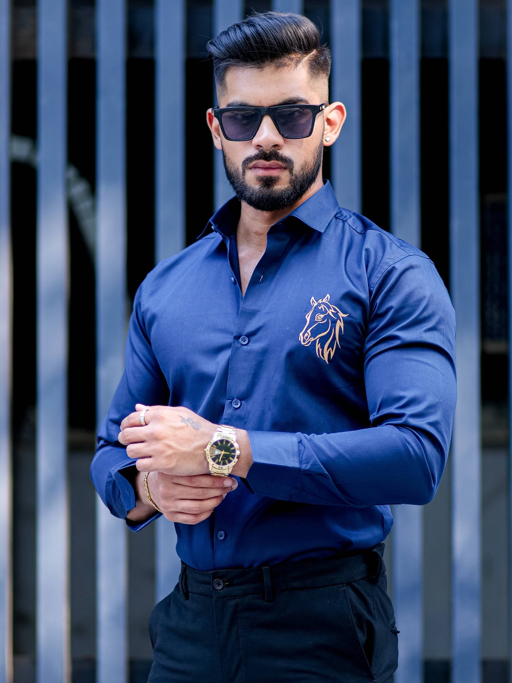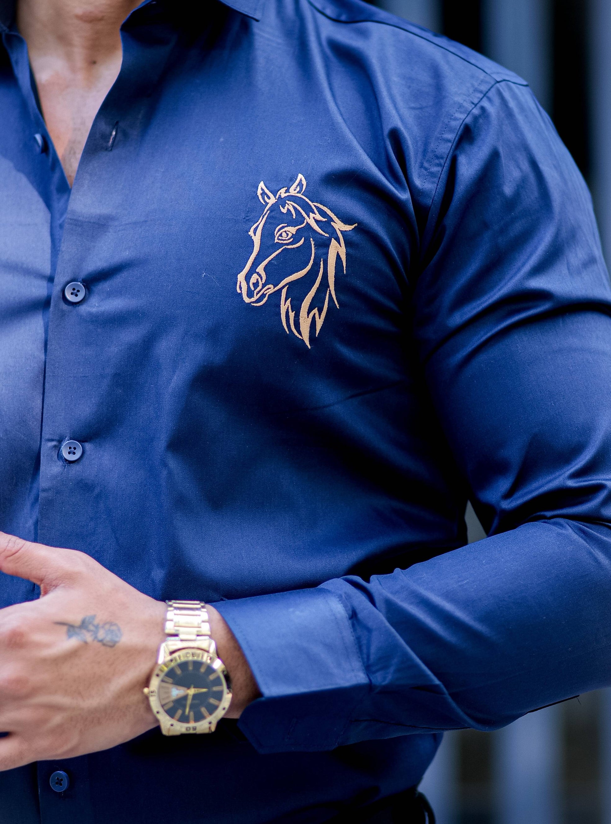 Horse Embroidered Navy Blue Premium Cotton Shirt