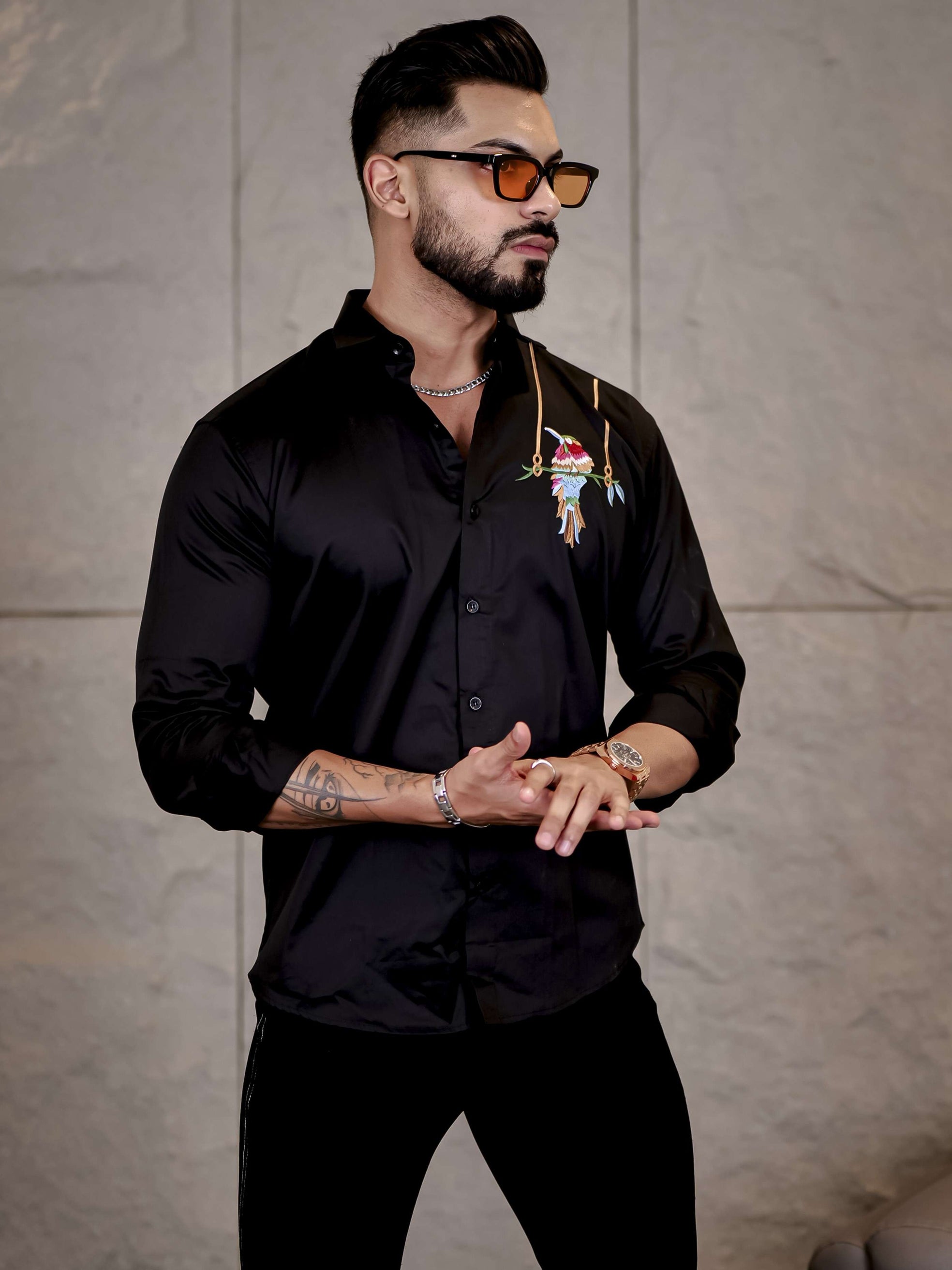 Black Bird Embroidered Premium Cotton Shirt For Men