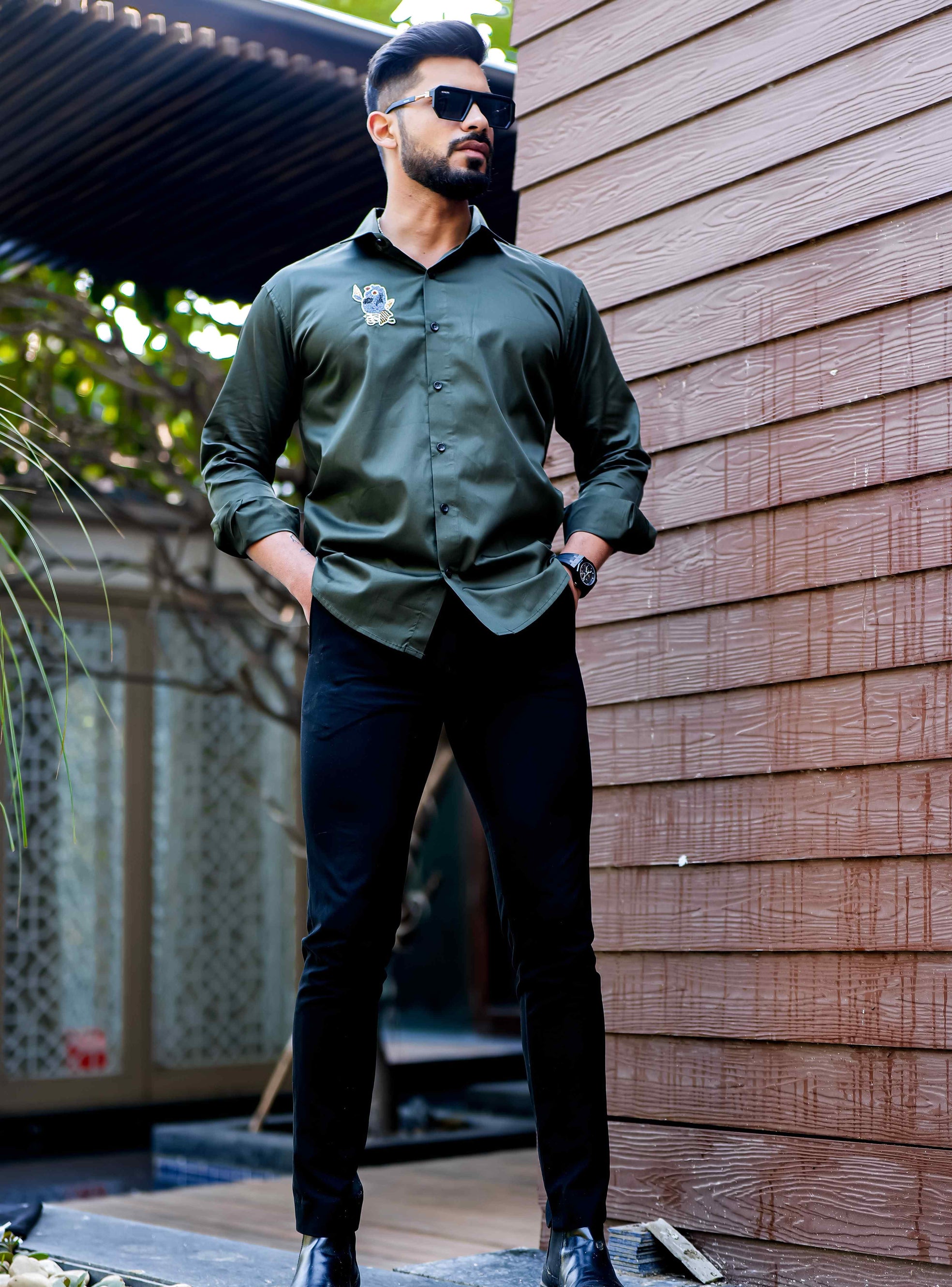 Olive Rhinestone Party Satin Cotton Premium Shirt