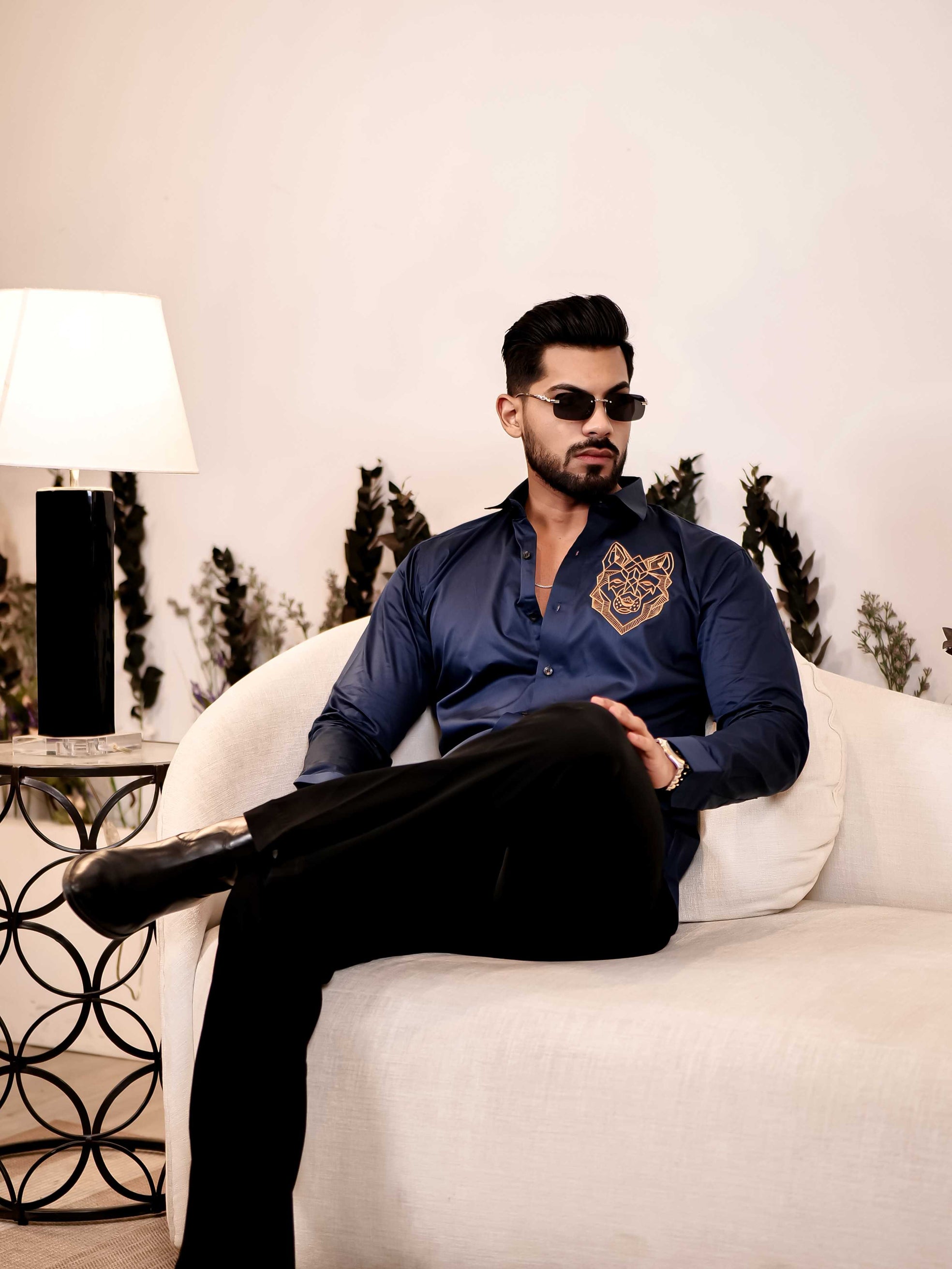 Line Art Wolf Navy Embroidered Club Wear Satin Cotton Shirt