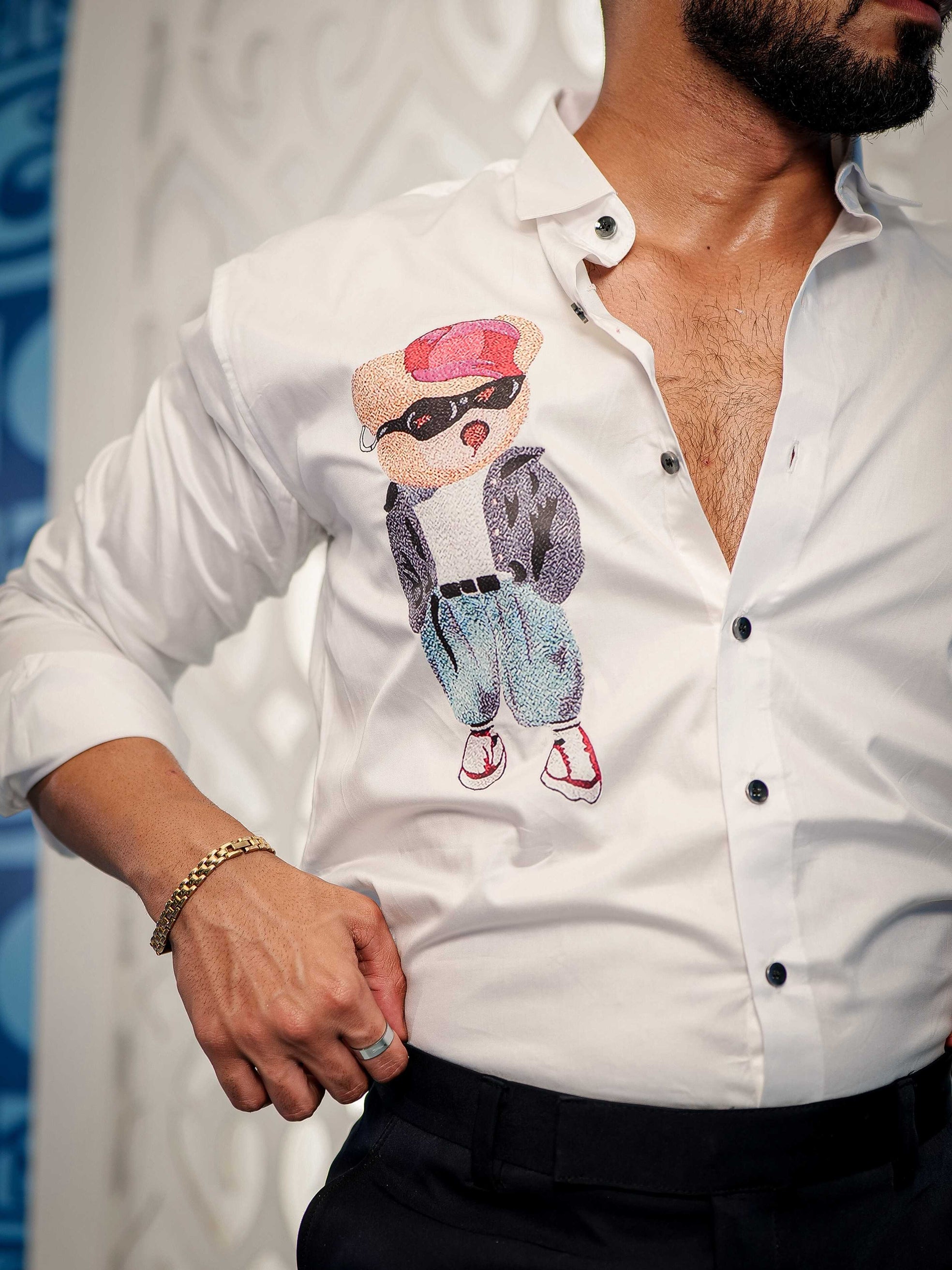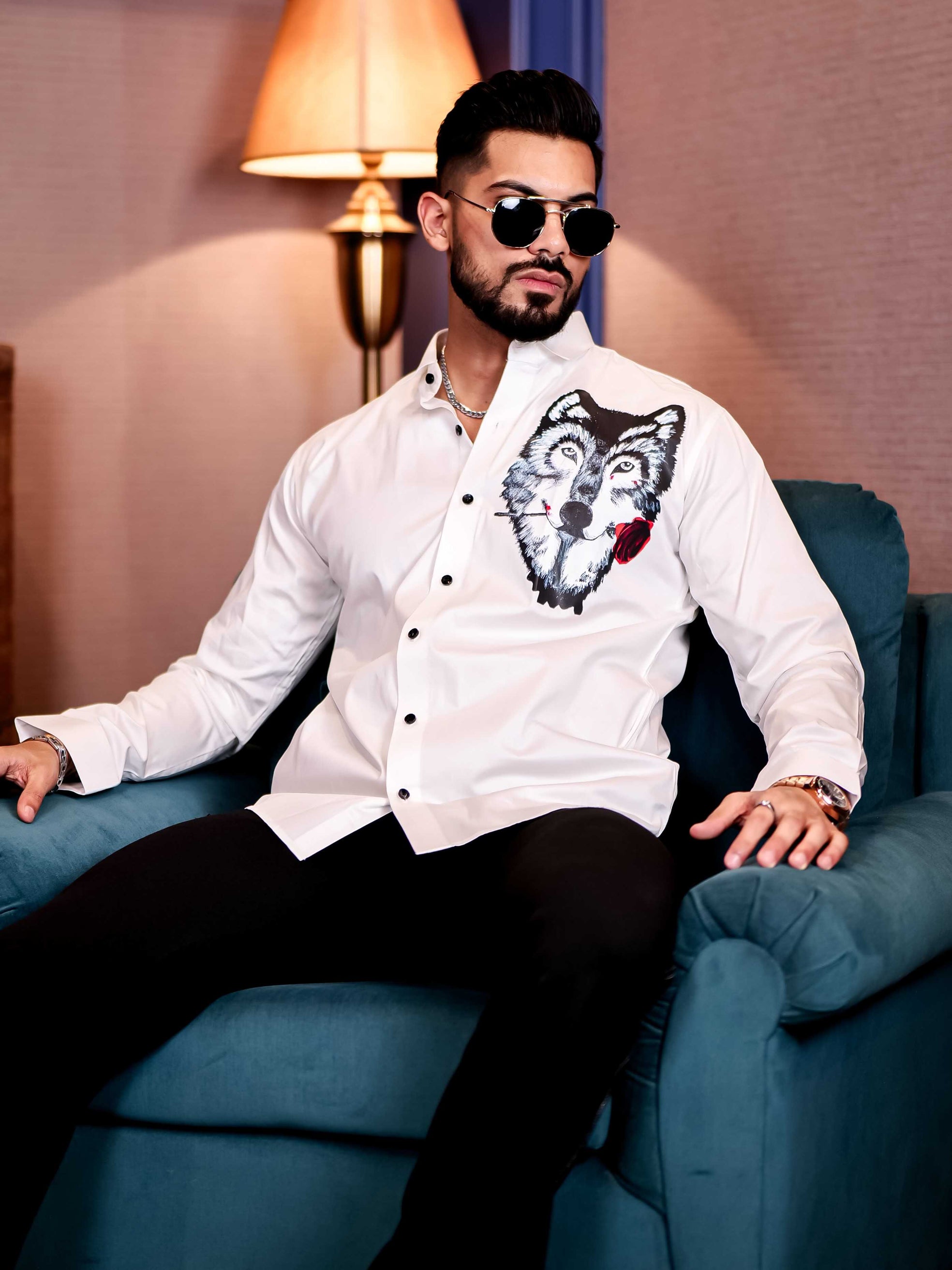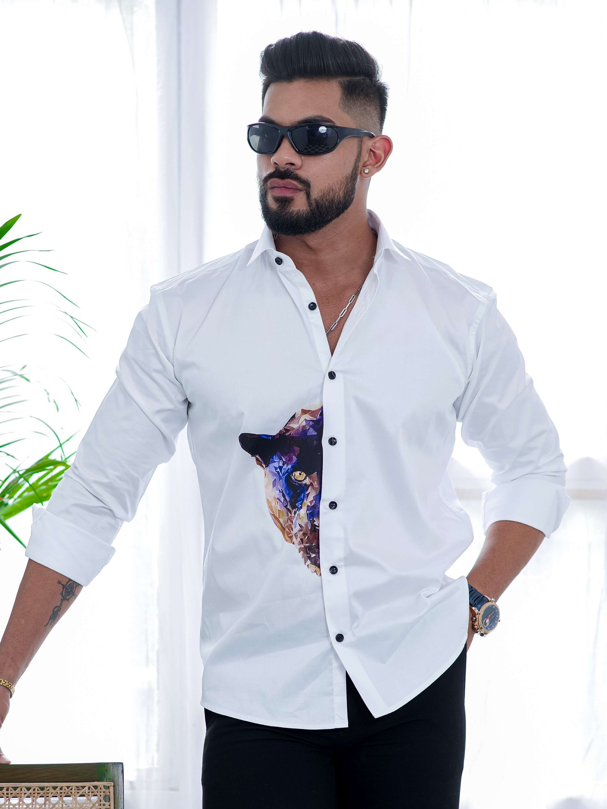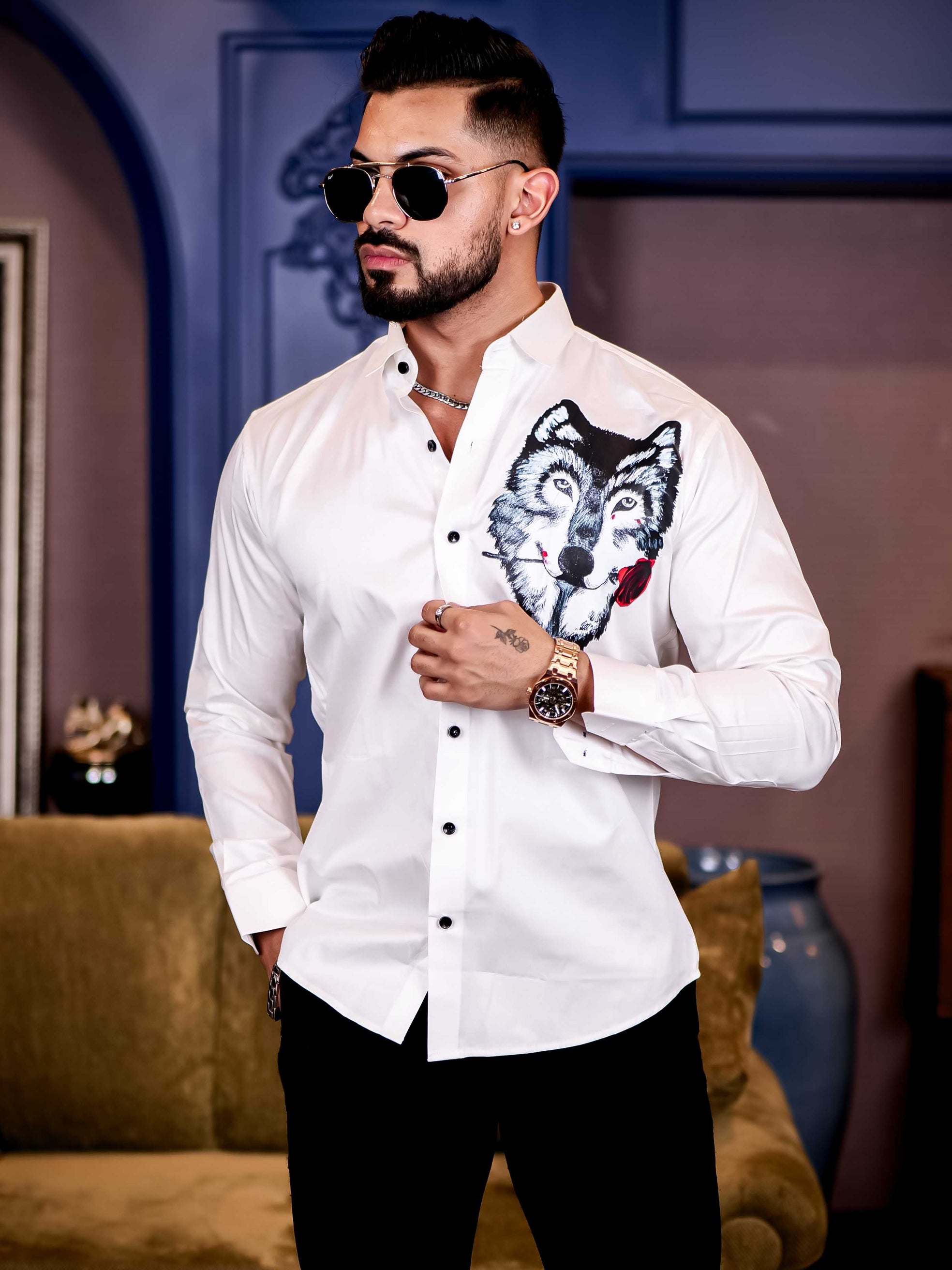 Wolf Love White Club Wear Printed Satin Cotton Shirt