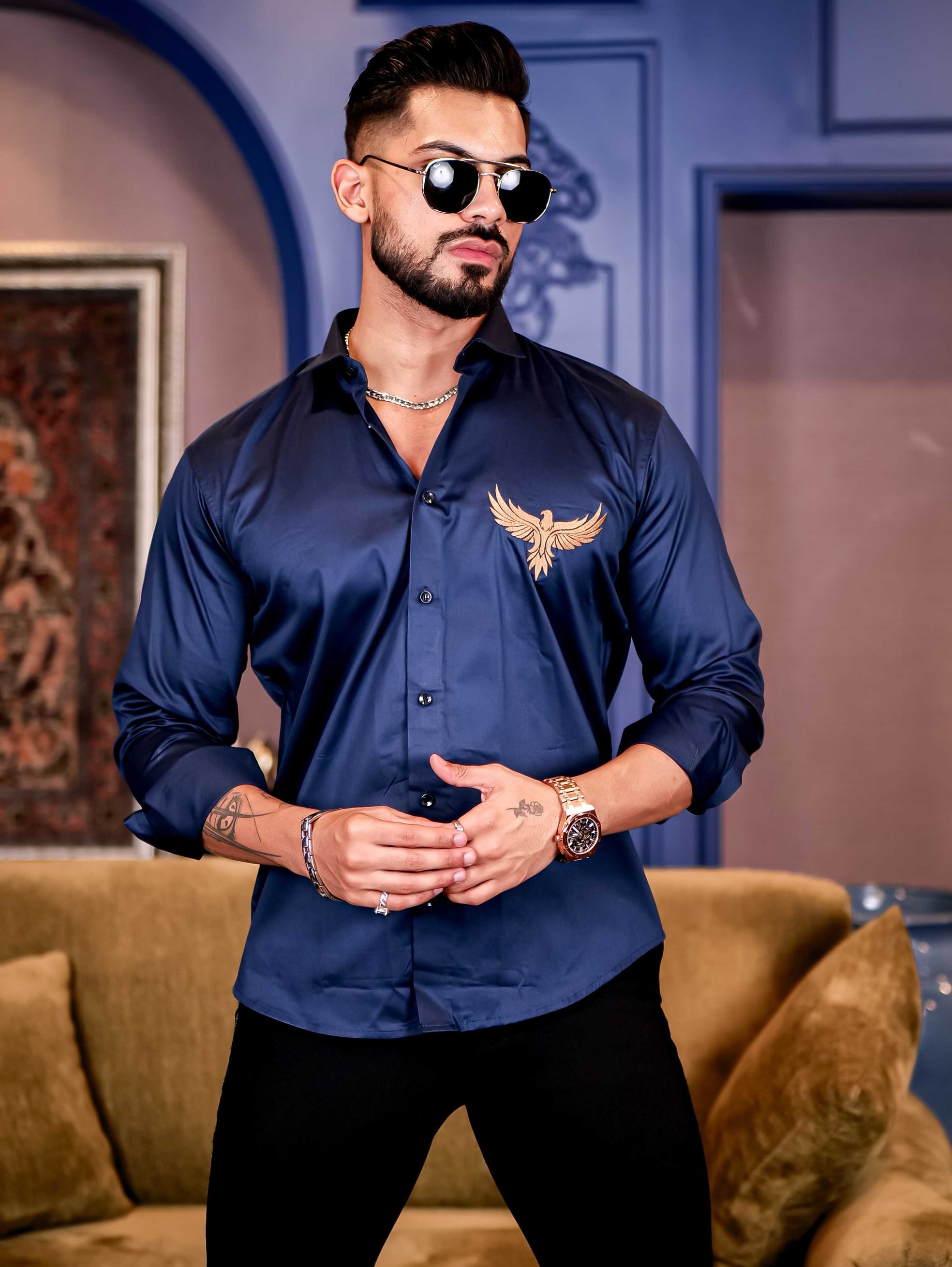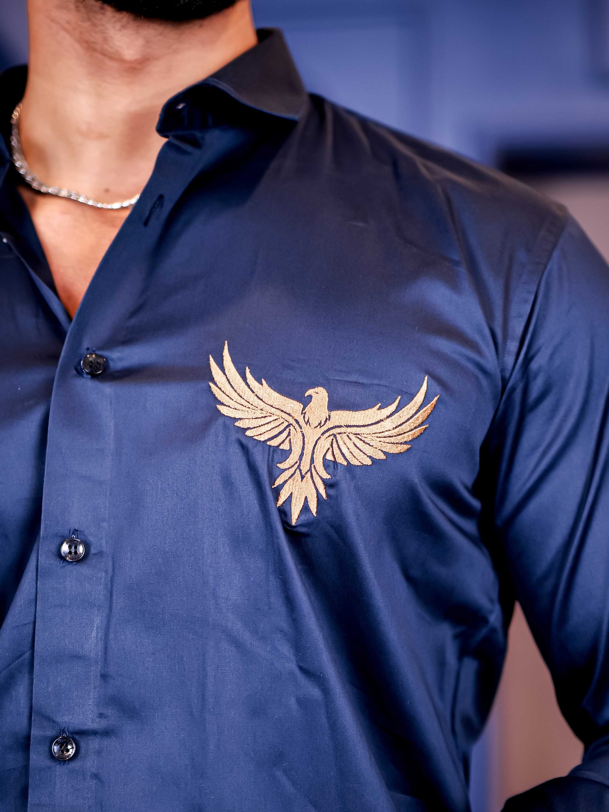 Falcon Navy Embroidered Club Wear Satin Cotton Shirt